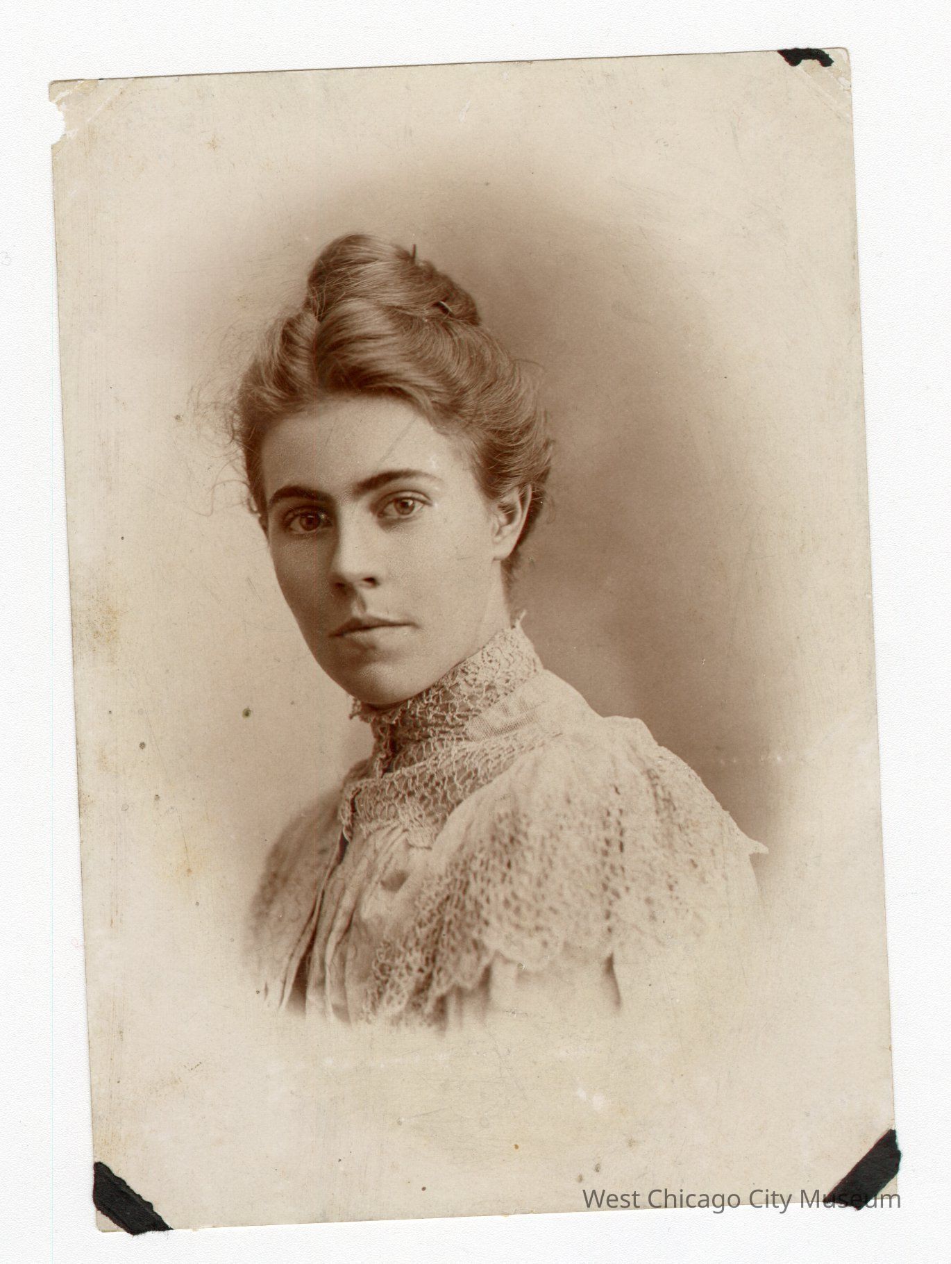Photo, b&w, Harriette Hills, n.d., c1891. 3 15/16" w x 5 1/2" h. Photo had been glued in a scrapbook, and has some black paper fragments stuck to the photo cornersPhotograph Details