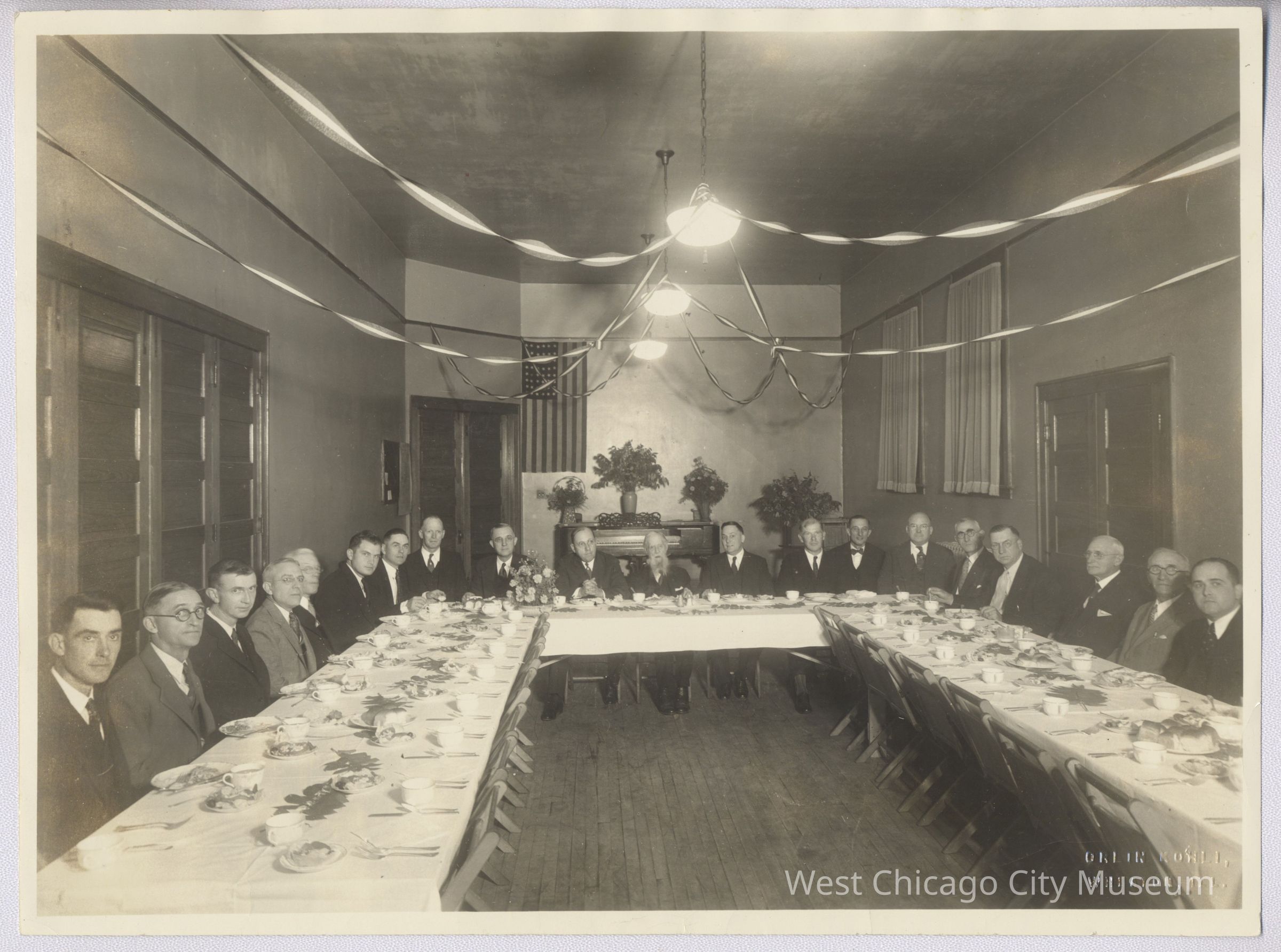 Photograph, b/w, "Past Masters Amity Lodge #472, AF& AM honoring Mr. Woods (in center)" written in blue pen on back of photo, men in suits seated at set U-shaped table, streamers hanging from 3 hanging light fixtures , piano in background with 3 floral arrangements on lid, American flag hanging on back wall, "ORLIN KOHLI, WHEATON, ILL." embossed in lower left corner, 10" w x 7 3/8" h. (partial identification accompanied photo)Photograph Details