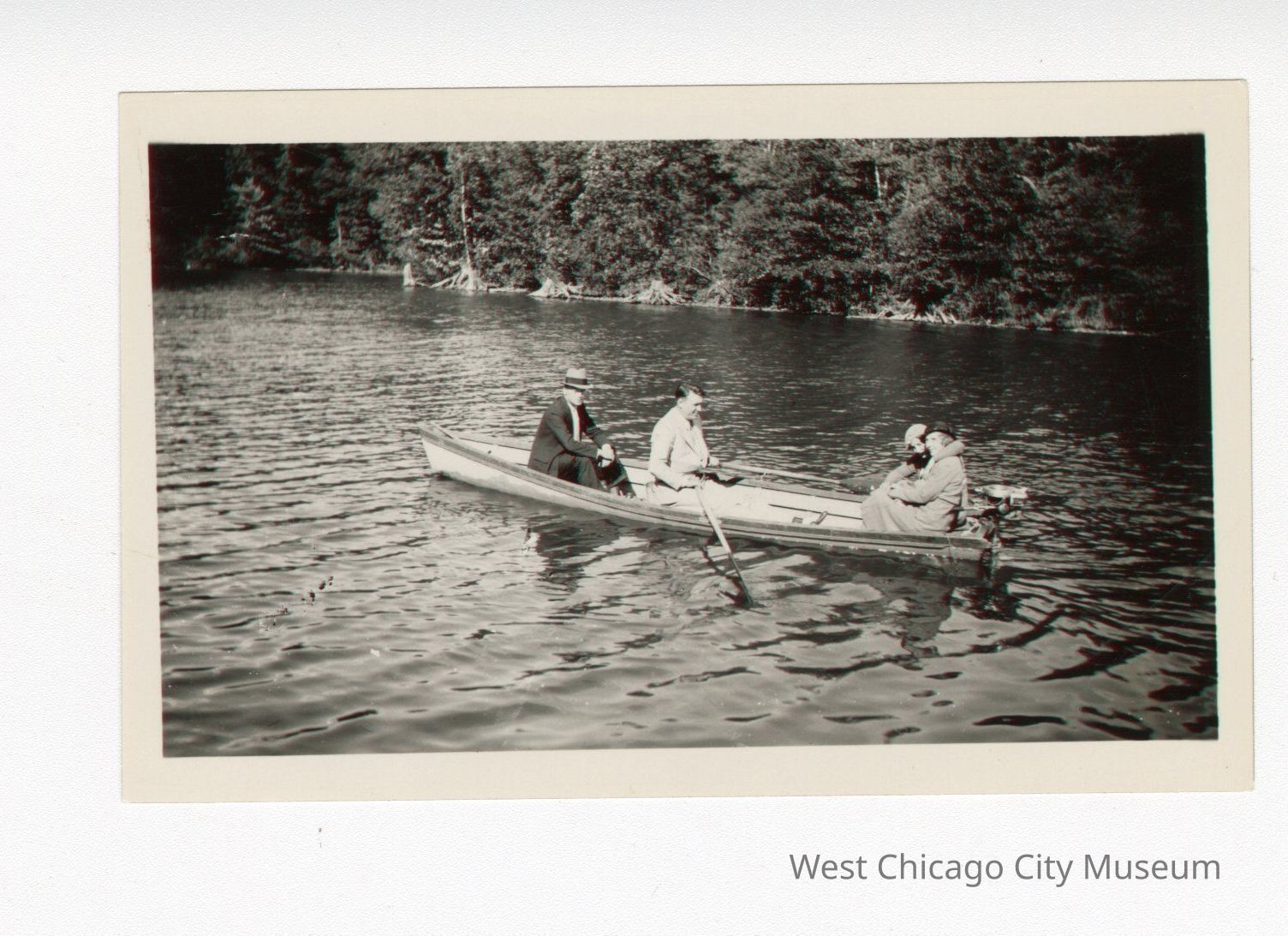 Photo, black and white of Jim Carr, Marg Carr, and two others in a row boat on a lake. Jim is to the left, Marg to the right, and a man sitting in the middle is rowing. Marg is sitting next to a woman in the back of the boat. Back of photo reads “Jim Carr on left, Marg Carr on right,Photograph Details