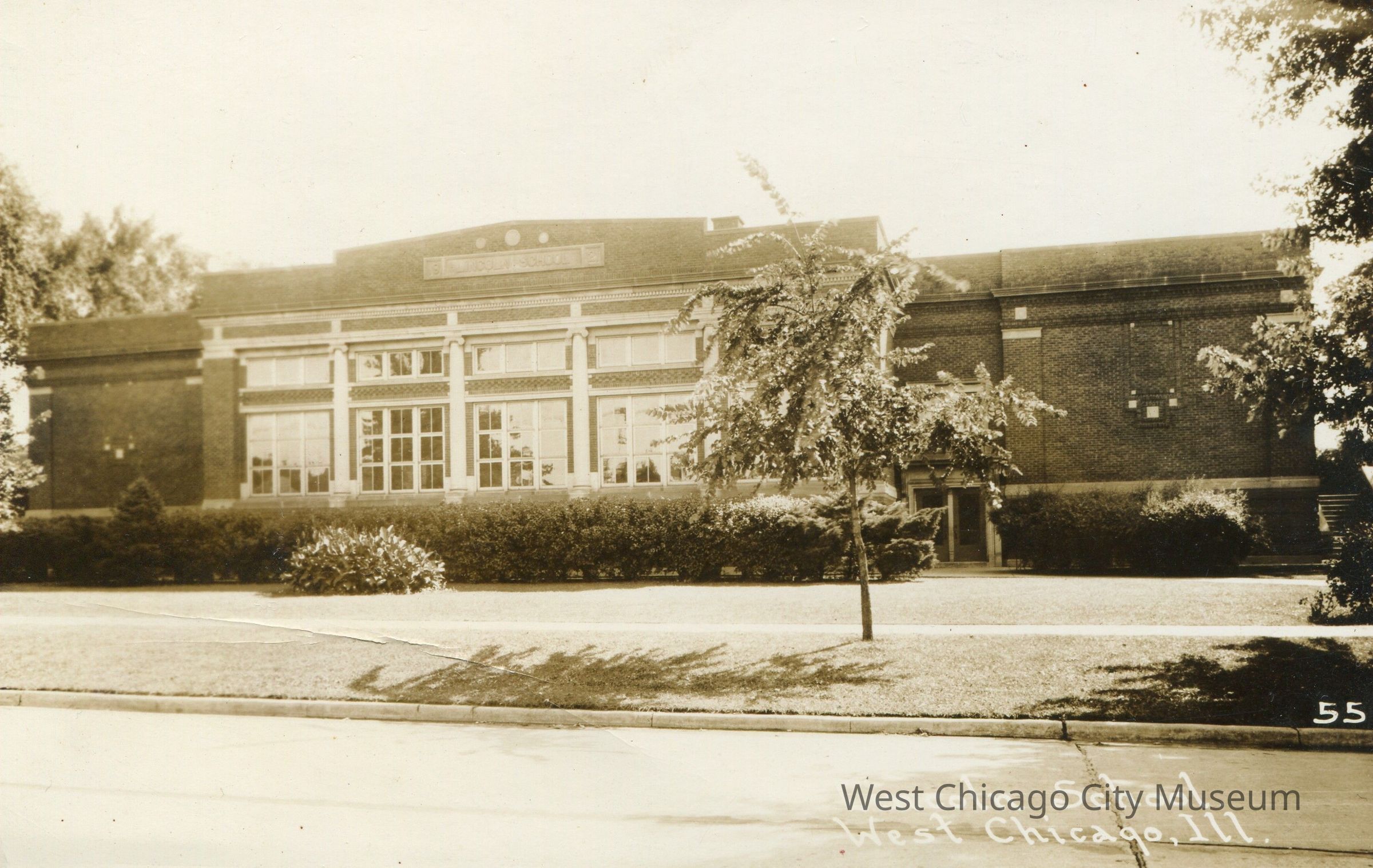 Real photo postcard, b/w, of Lincoln School, West Chicago, front view circa 1930s. Photo shows front of school with five panes of windows, far right pane obscured by tree. Above windows, names of school is in stone relief. Double doorway is just to right of windows, exterior staircase at far right. Sidewalk and street in front of school in foreground. "Lincoln School West Chicago, Ill." written in white at bottom right, "55" written just above at far right. Same view as 1987.003.0004.Collection