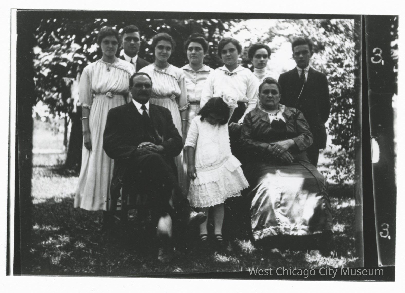 B&W photo, Hayward family, LtoR Clara, Elmer, Carrie, Bertha, Laura, Jessie, Clarence, seated: Arthur, Florence (standing), Fredericka