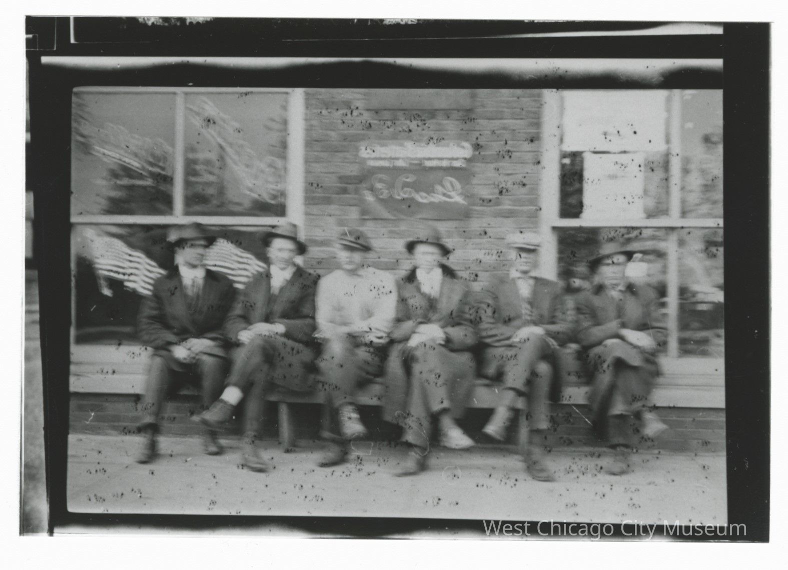 B&W photo, six men sitting in front of Seanor's Garage, man at left is Elmer Hayward, Photo is printed in reversePhotograph Details