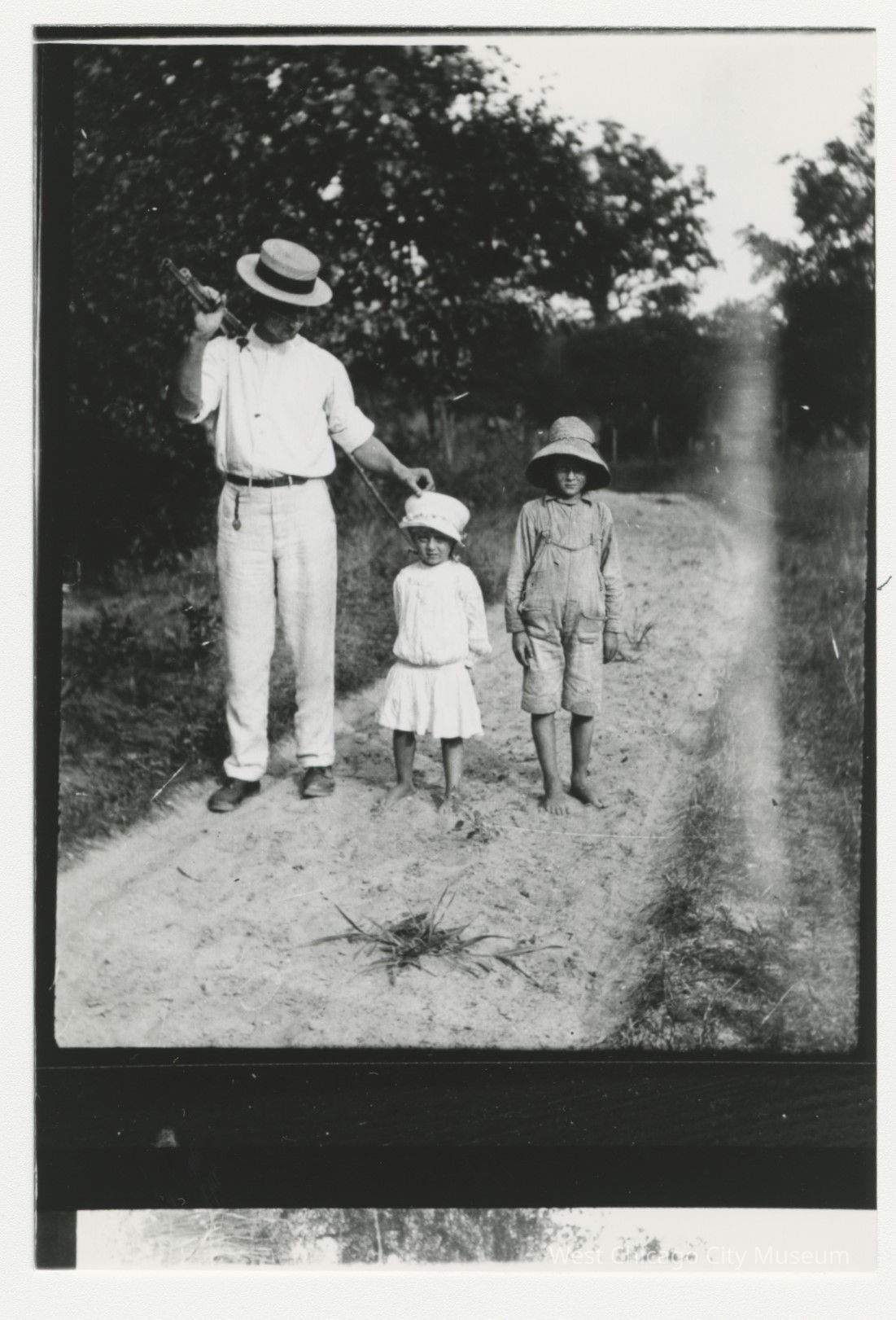 B&W photo, man with fishing pole and young girl and boy (same as in 83.7.14)