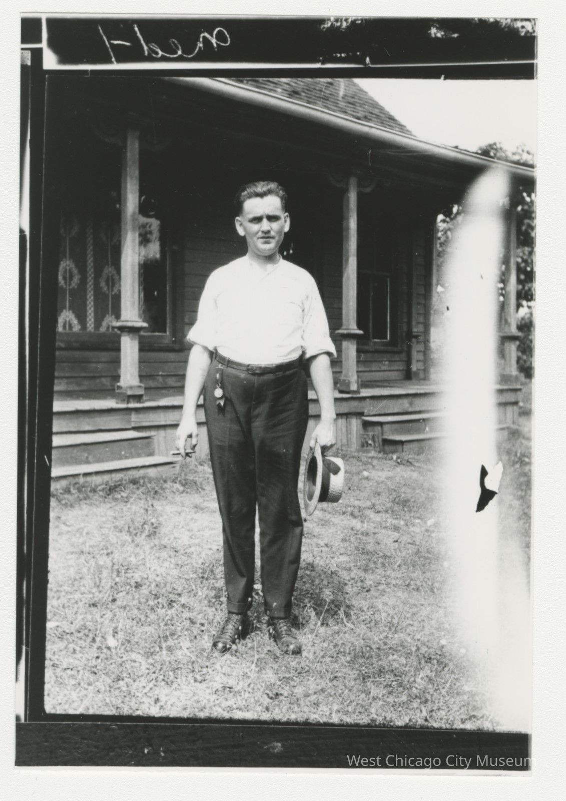 B&W photo, Unindentified men holding straw hat and cigar