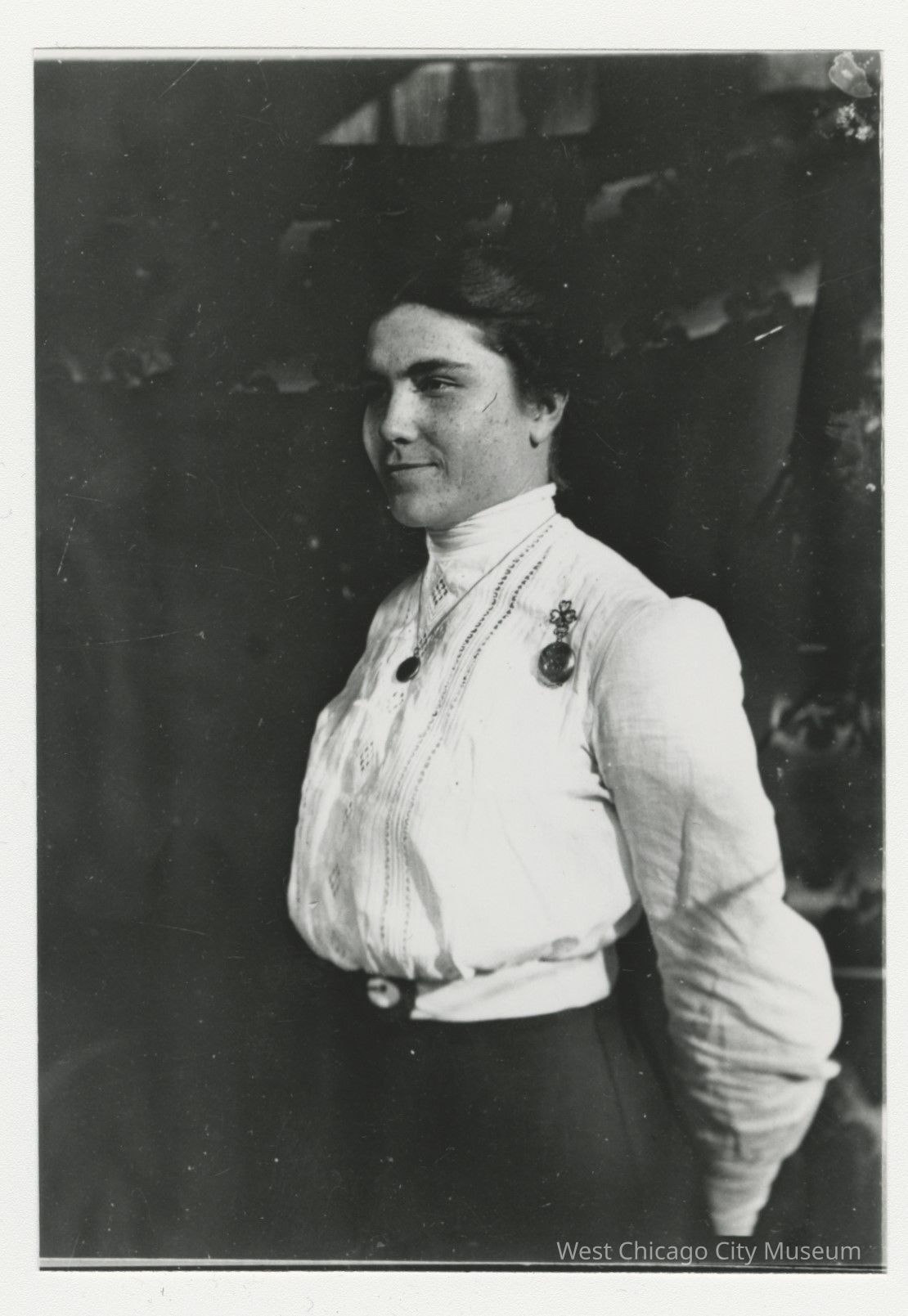 B&W photo, Bertha Hayward with her hands behind her back