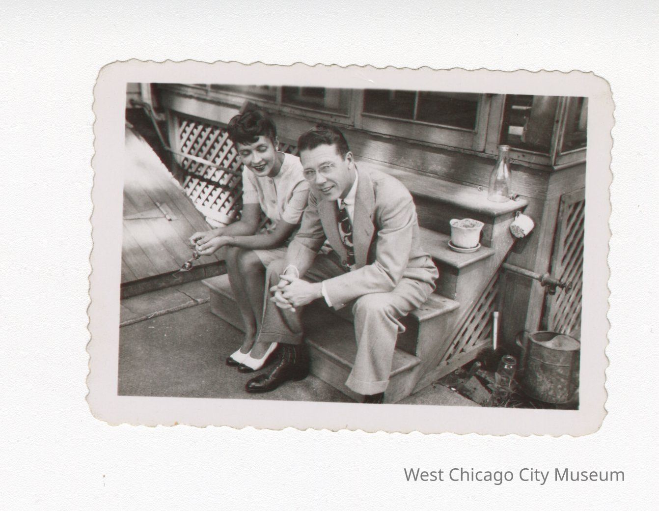 Photo, black and white of Wilfred Carr and a woman sitting on steps outside of a screen door. Wilfred is to right and wearing a suit and glasses. The woman to the left is wearing white shoes and is looking at Wilfred. In the left background is a cellar door. Back of photo reads “Wilfred Carr ?,Photograph Details