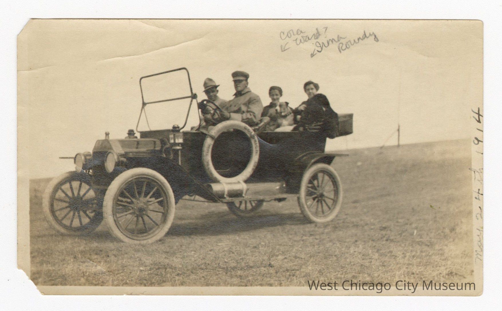 Photo of Irma Roundy and Cora Ward riding in a car with a Letter from Irma to Charles Roundy on the back
