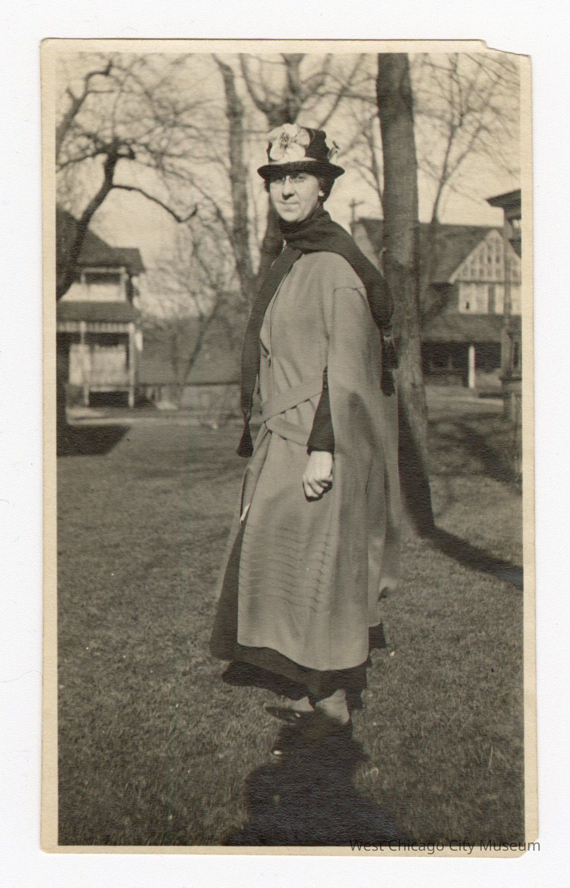 Photo of Irma Roundy standing outside in a topcoat scarf and flower hat