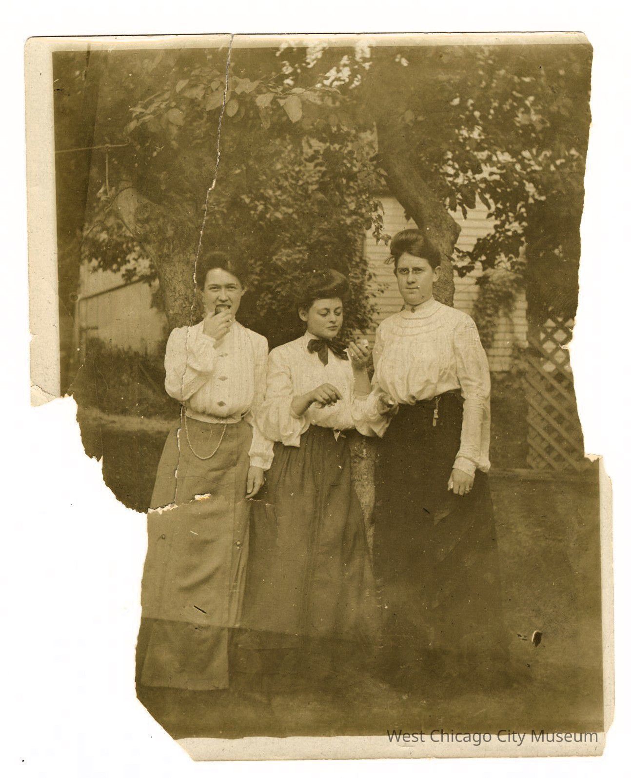 Photo of Irma Roundy and two others eating apples in front of trees outside