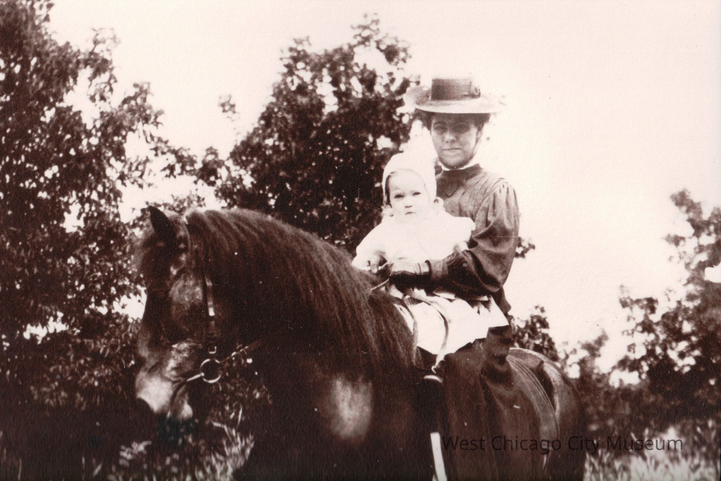 Photograph of Miss Herriette E. Hills on horse holding Marguerite Keese Azer as a young child. The photograph is sepia toned with shrubbery and trees in the background.Photograph Details