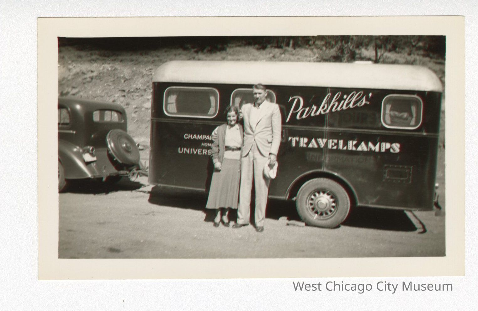Photo, black and white of Gertrude Lyons Parkhill and a man, probably Mr. Parkhill standing in front of a Parkhill’s traveling camper. Gertrude is to the left and the man is to the right with his arm around her. The camper is hooked up to a car, which is in the left background. Back of photo reads “Gertrude Lyons Parkhill (I suspect this is Mr. Parkhill),Photograph Details