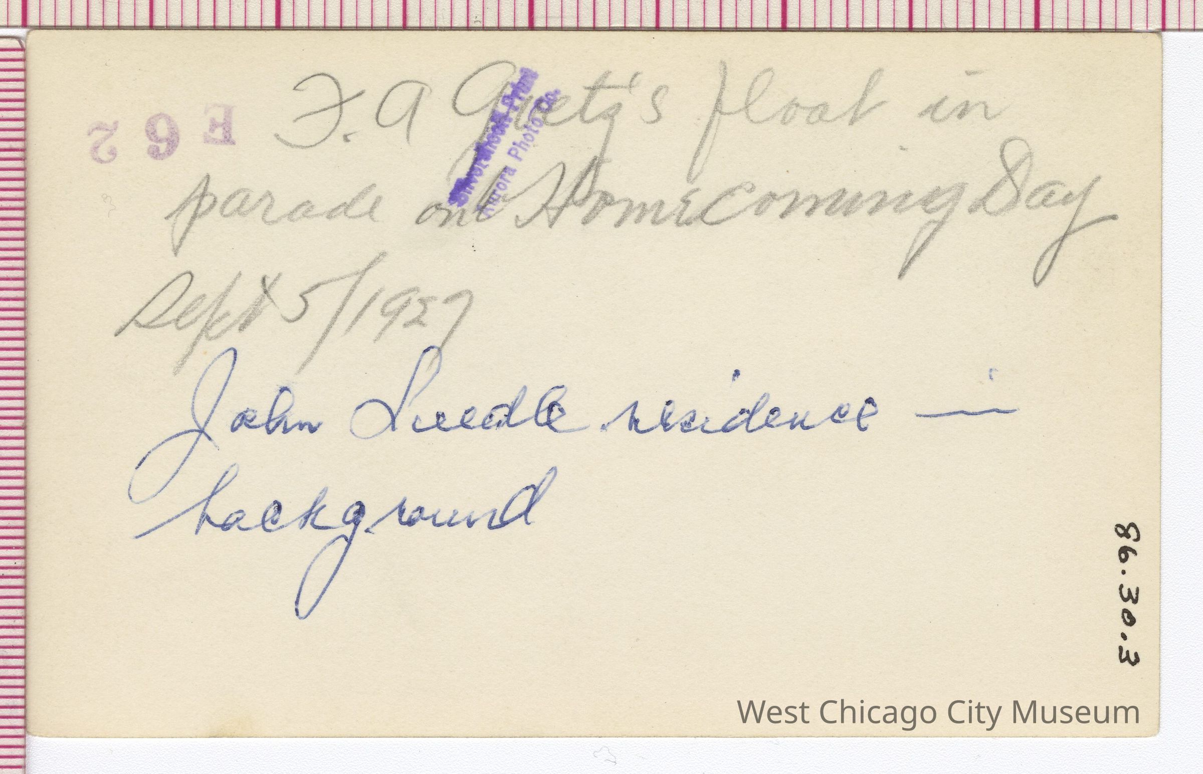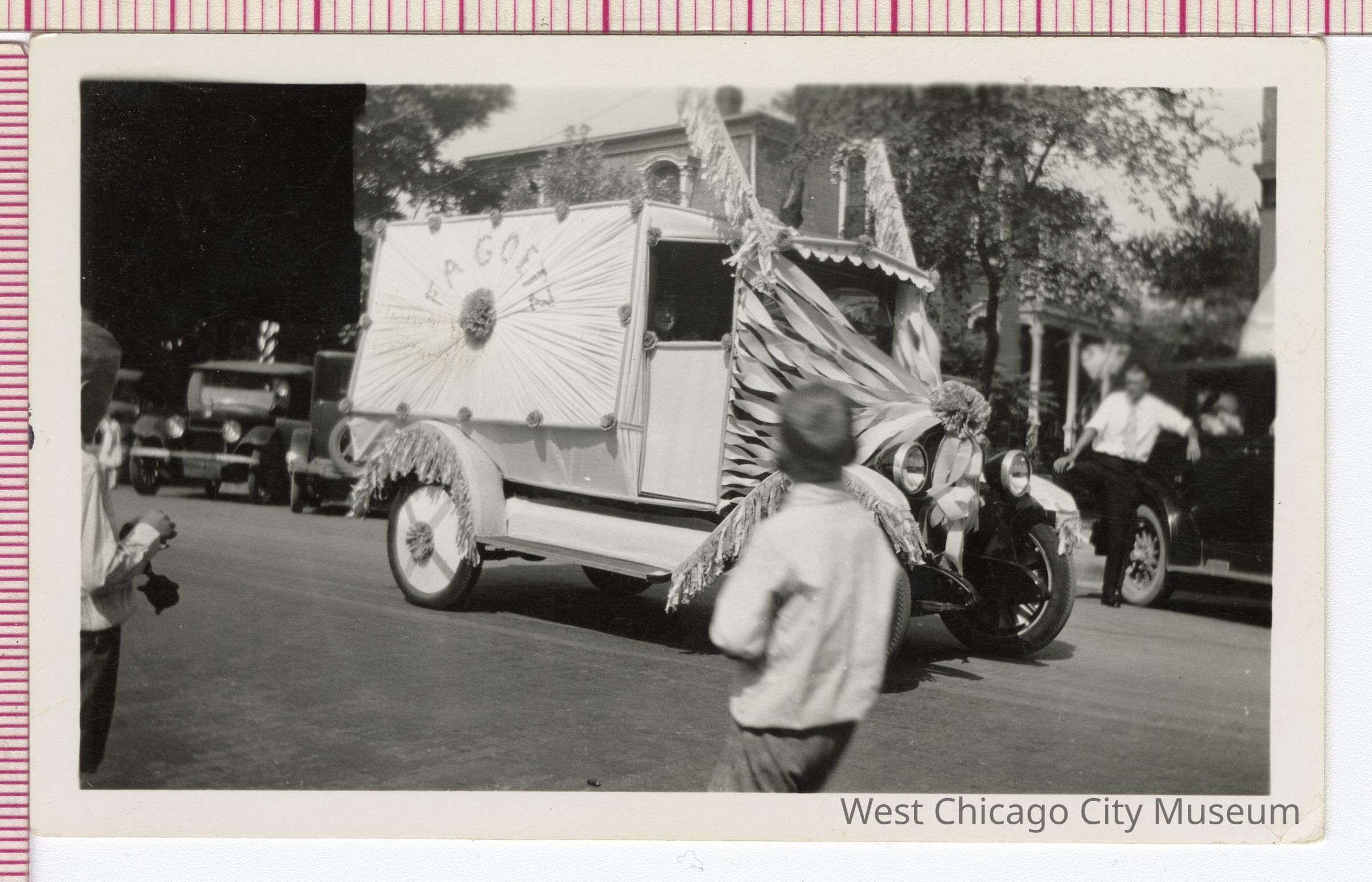 photographs of May, 1927 Homecoming Parade in West Chicago (F. A. Goetz's Float)