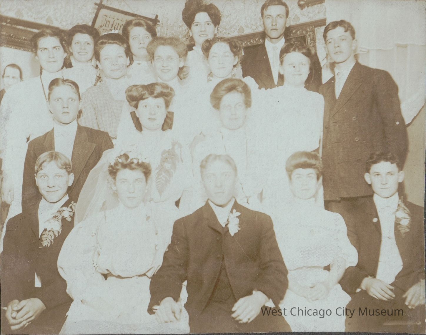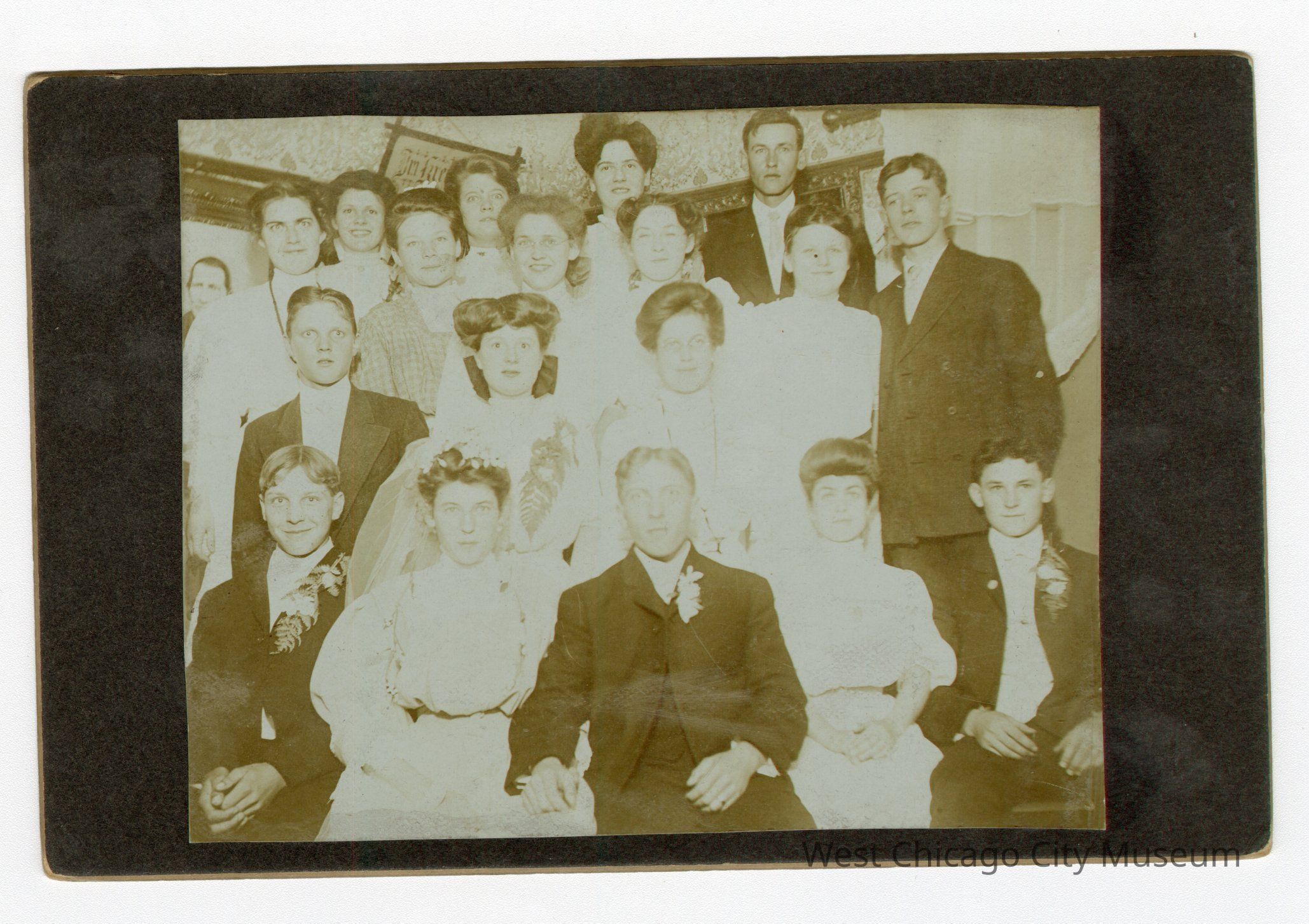 4x5 Photograph of 18 persons, including Mr. Albert & Mrs. Emma Voelz, Mrs. Bahnfleth's parents (possibly their wedding)Photograph Details