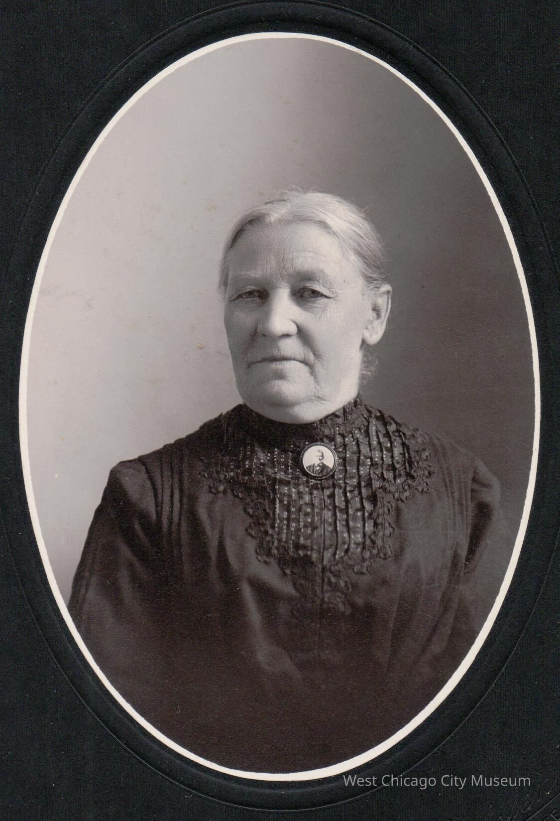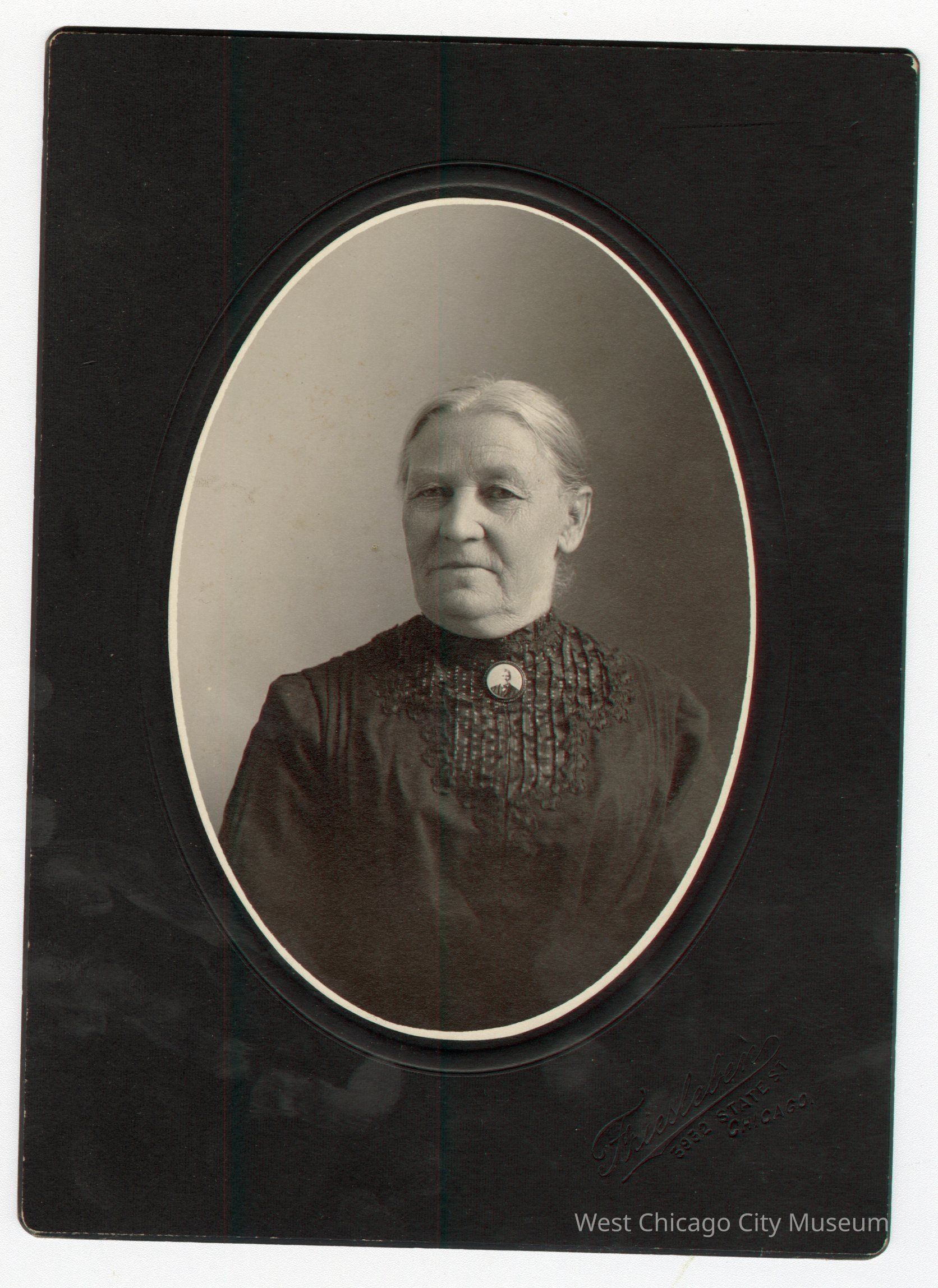3x5 Oval Photograph of Mrs. Voelz, Mrs. Bahnfleth's paternal grandmother (Fredericke Voelz). Shows an older woman, seated. She has grey pulled back hair and is wearing black. On her broach at her throat is a painting or photograph of a man. Mounted on a black matt that is embossed to look like water silk.