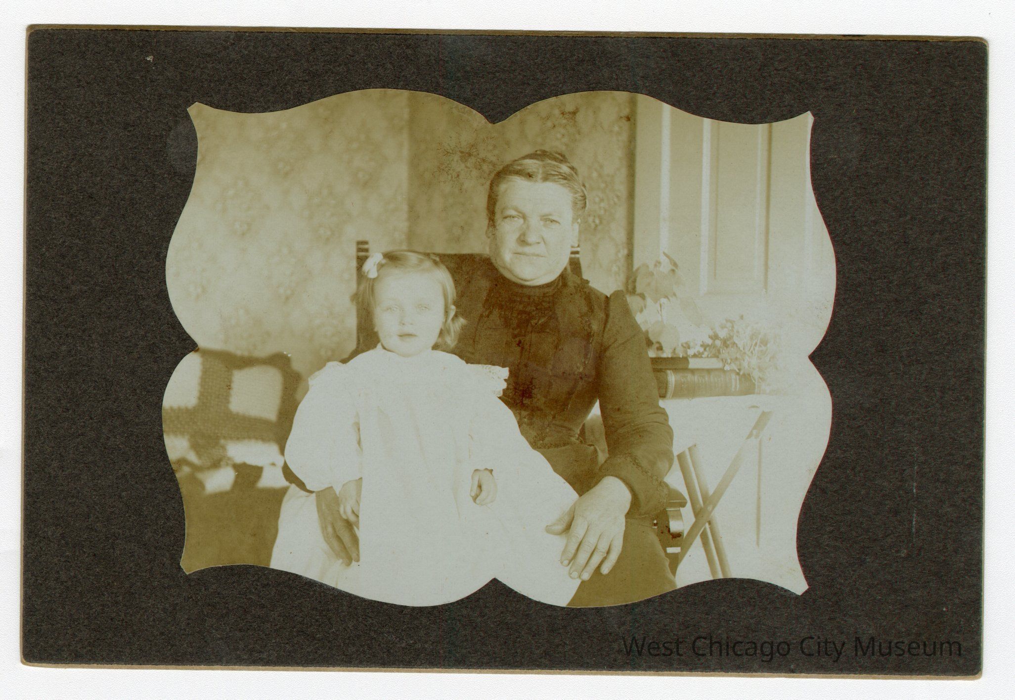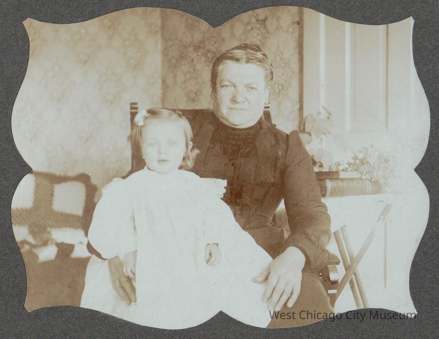 3x4 Photograph of Mrs. Bahnfleth's maternal grandmother, Mrs. Klug (Wilhelmine “Minna” Graunke Klug). She is sitting in an airy room, with a child in white on her lap. Behind her is a table with books and plants, and a small settee on the left. The photo has been cut into a decorative quatrefoil or pointed clover shape, and pasted to black paper (possibly in a scrapbook)Photograph Details