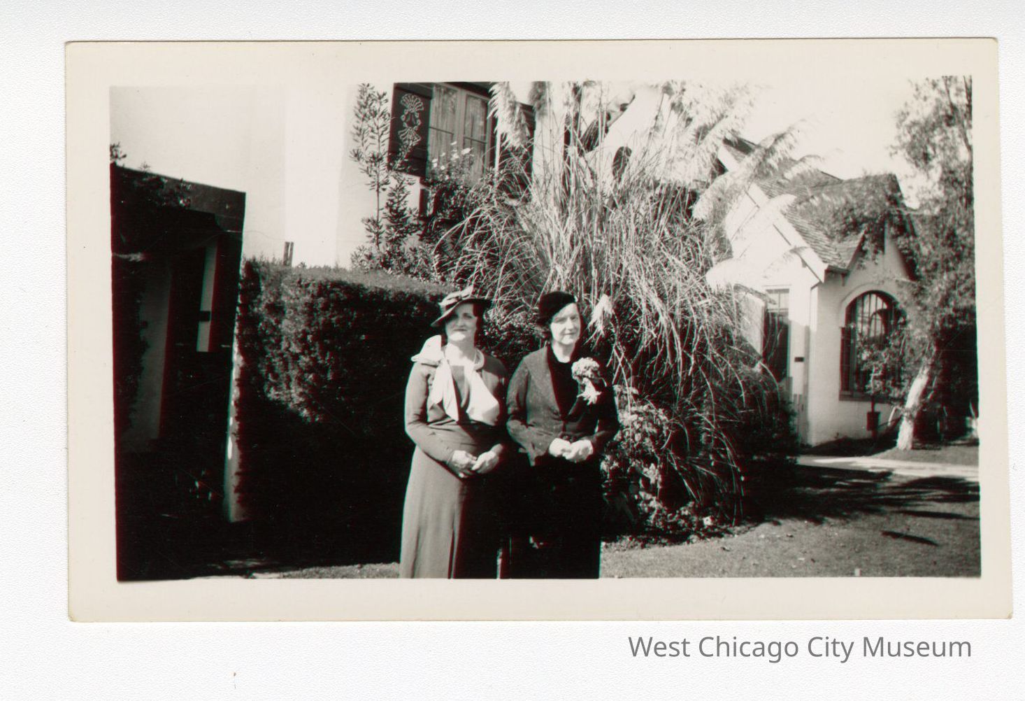 Photo, black and white of Gertrude Lyons Parkhill and another woman standing in front of a house. The two are standing side-by-side. In the background is a house that has a few tall bushes in front of it.Photograph Details