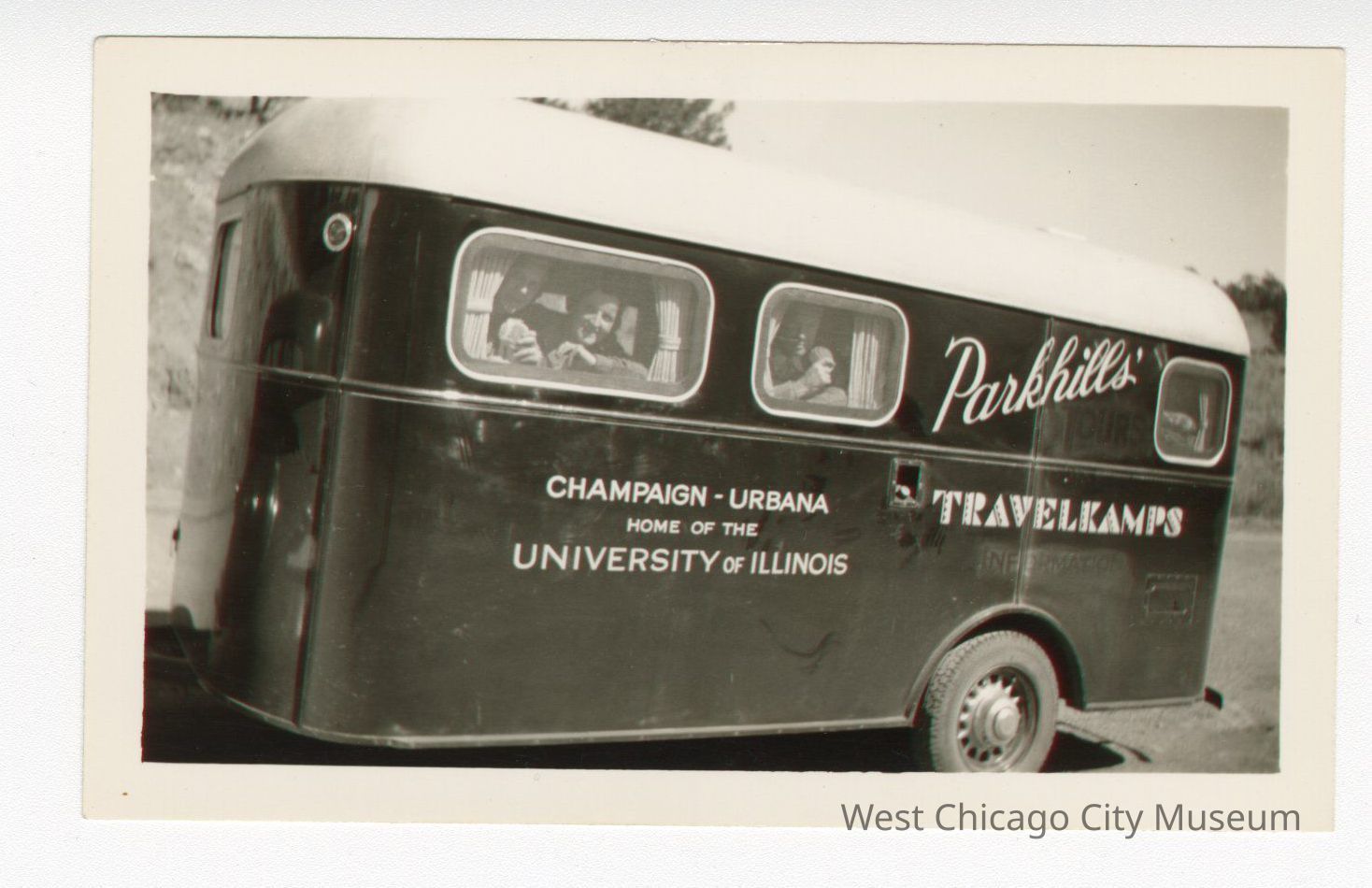 Photo, black and white of a Parkhill’s traveling camper. Three people are inside the camper and looking out the window at the camera.Photograph Details