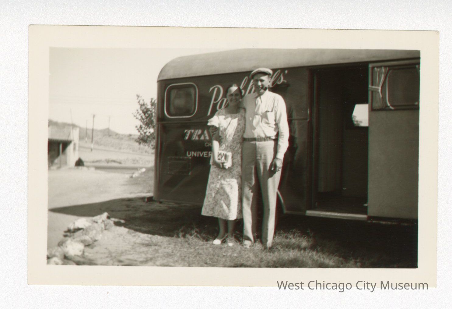 Photo, black and white of a middle aged man and woman standing in front of a Parkhill’s traveling camper. The camper is parked just off the side of a road and the woman is standing to the left of the man. Both are looking at the camera and smiling. The door to the camper is open.Photograph Details