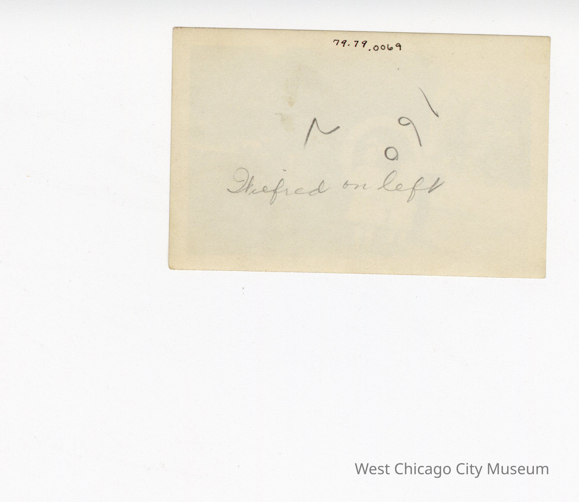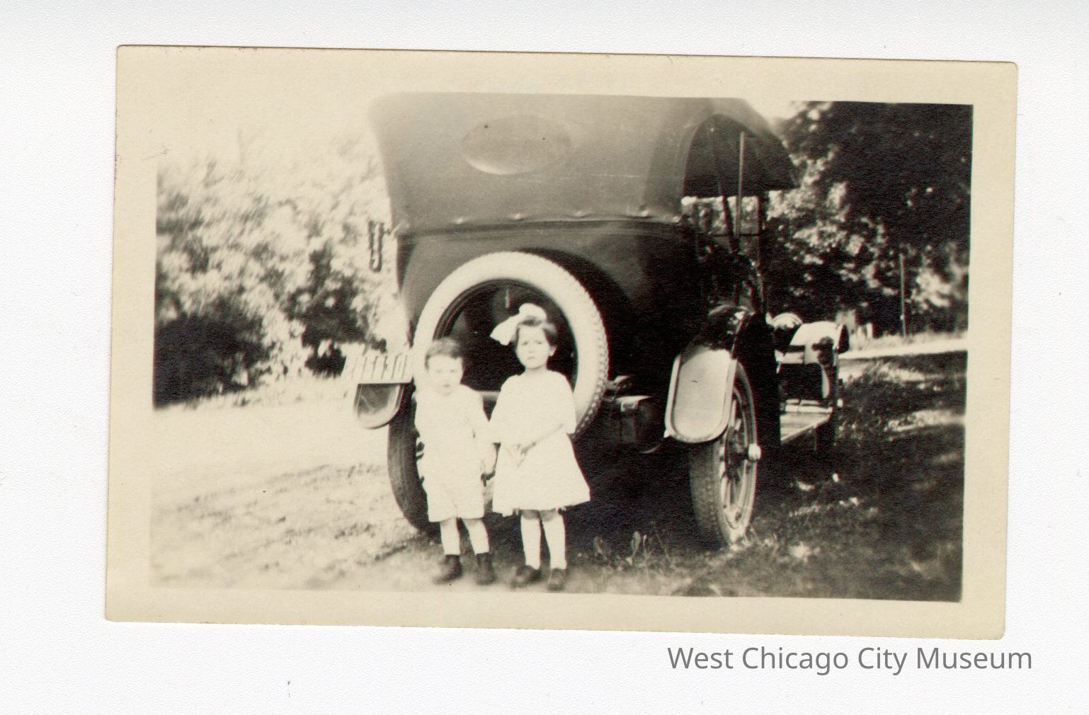 Photo, black and white of Wilfred Carr as a very young boy with a young girl. The two children are both wearing white and standing behind a parked car. Wilfred is to the left and the girl, with a large bow in her hair, is to the right. Back of photo reads “Wilfred on left,Photograph Details
