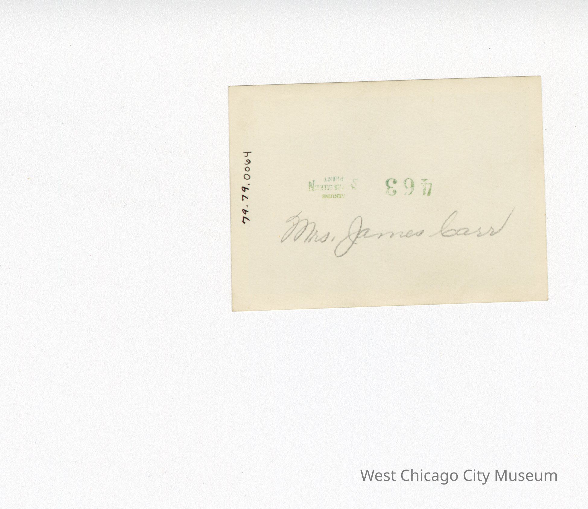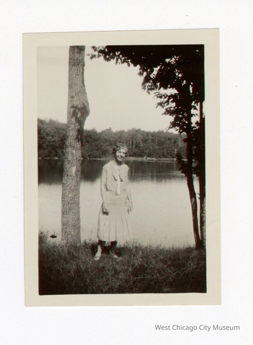 Photo, black and white of Mrs. James Carr standing in front of a lake. She is standing in tall grass with a tree on either side of her. She is looking at the camera and smiling. Back of photo reads “Mrs. James Carr,Photograph Details