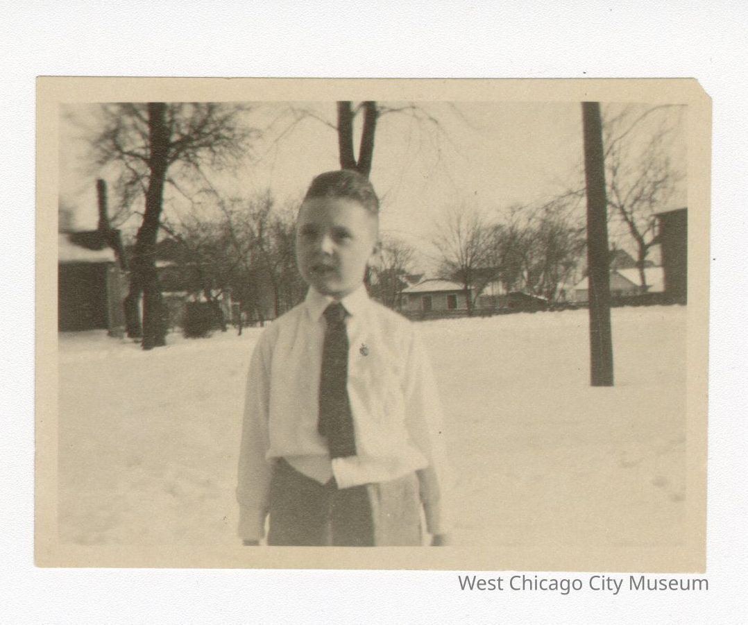 Photo, black and white of Wilfred Carr as a boy. He is standing in a snowy yard with trees and houses in the background. Wilfred is wearing a white dress shirt and a dark tie. The photo is from his waist up. Back of photo reads in pencil “Wilfred Carr,Photograph Details