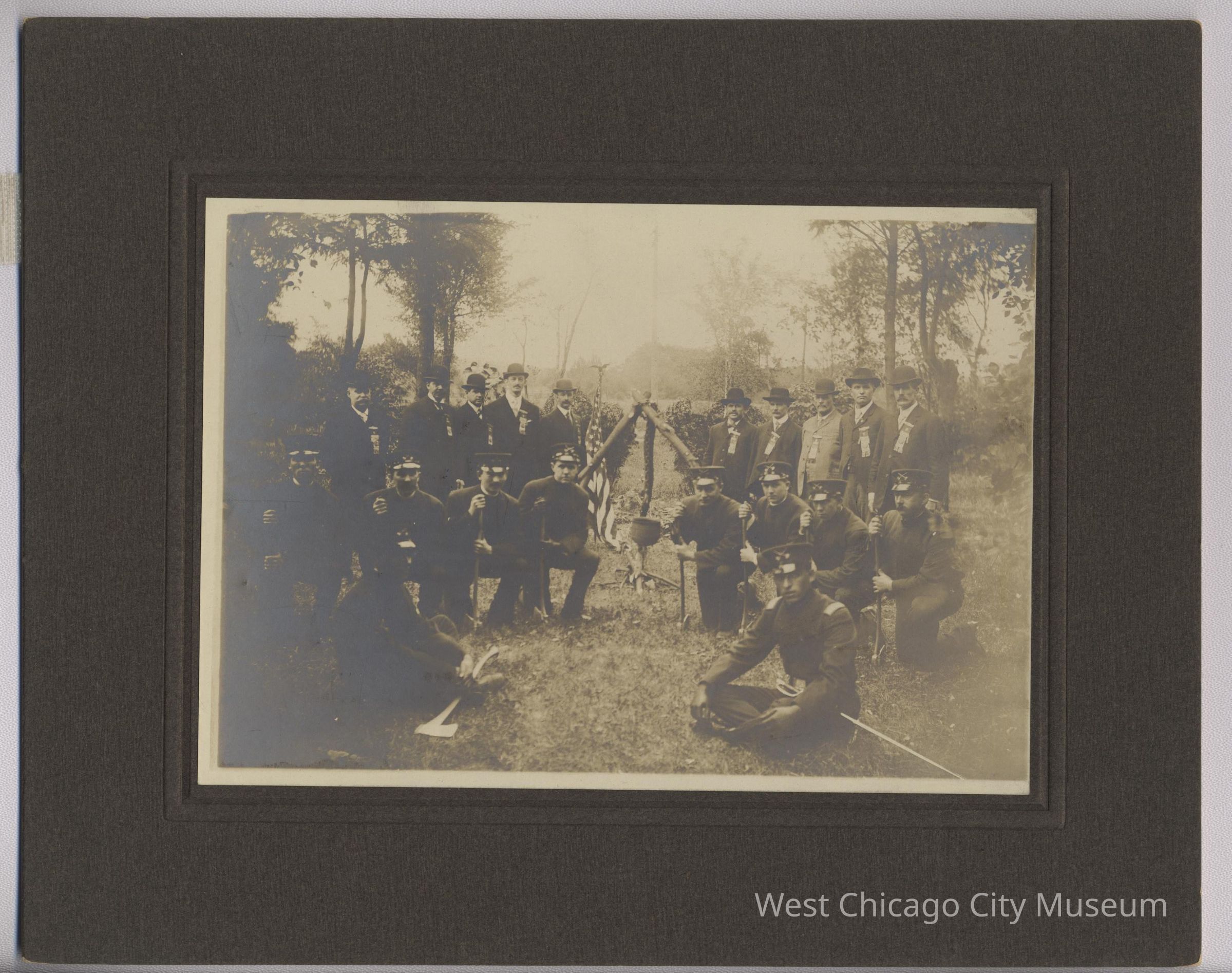 Photograph, b&w on cardboard mount, 8" h x 10"1., Modern Woodmen in large group outside. Floyd Gridley is in back row, fourth from left.Photograph Details