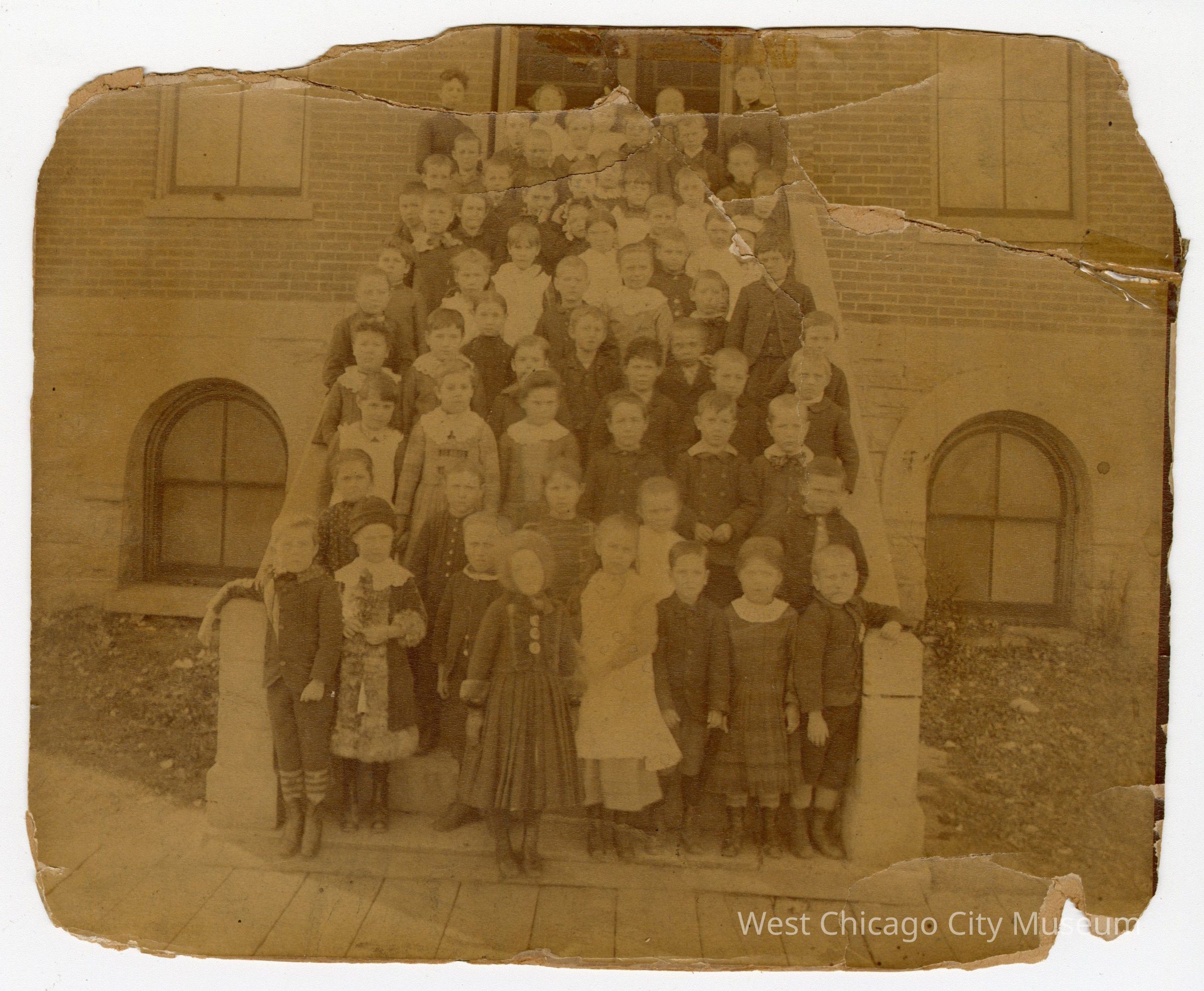 Photograph of the Northside of the School with Irma Roundy's class standing at the entrance, fairly clear imagePhotograph Details