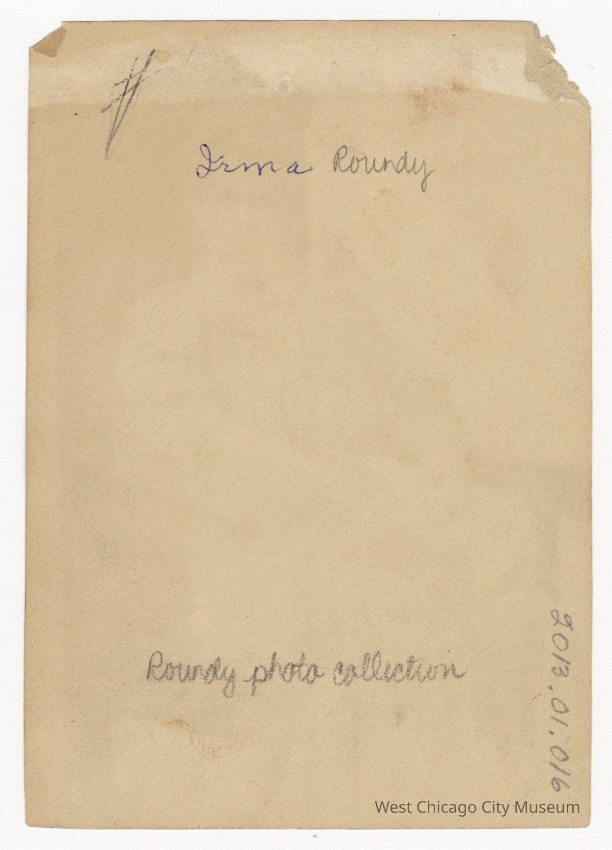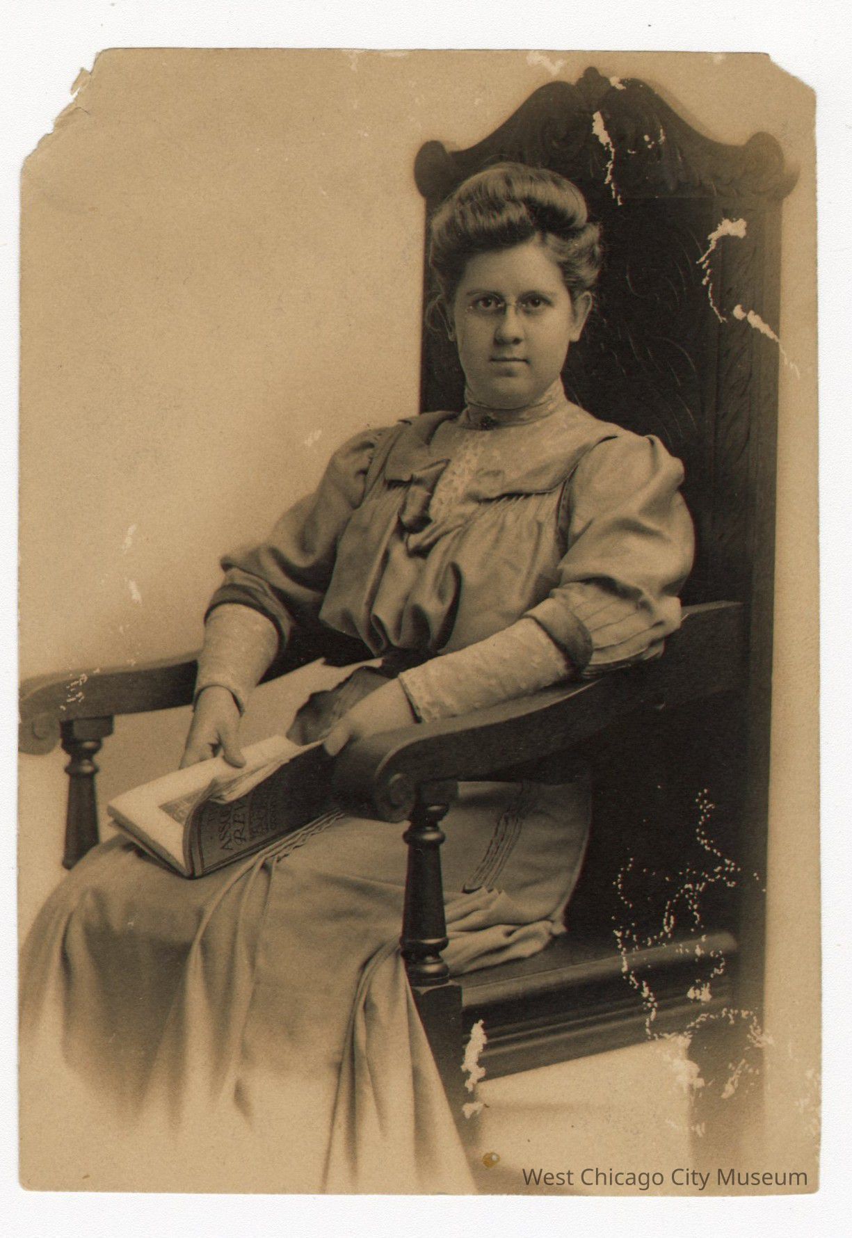 Photograph of Irma Roundy seated on an ornate sturdy chair, clear image-somewhat darkenedPhotograph Details