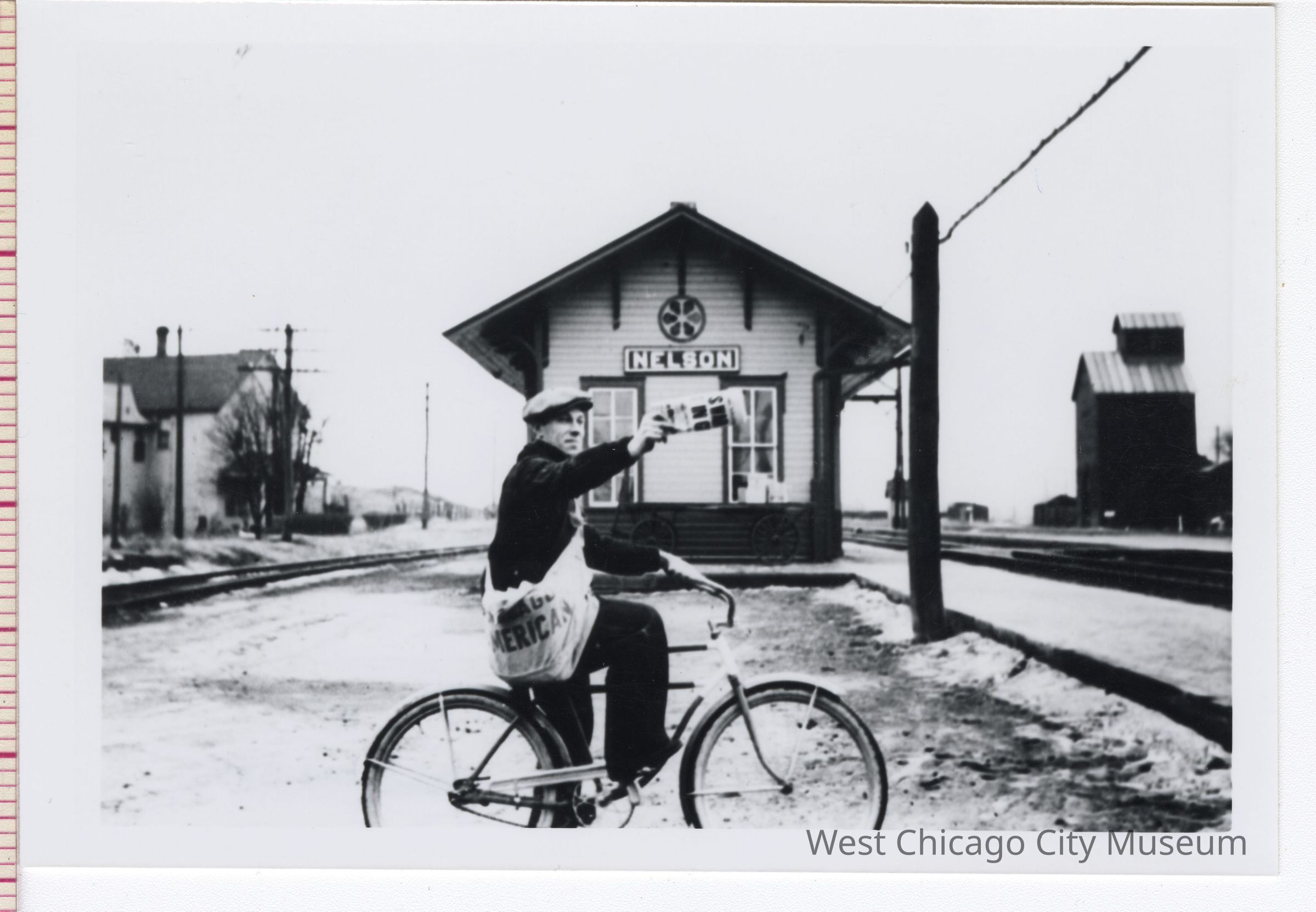 Man on bike in front of Nelson Train Depot