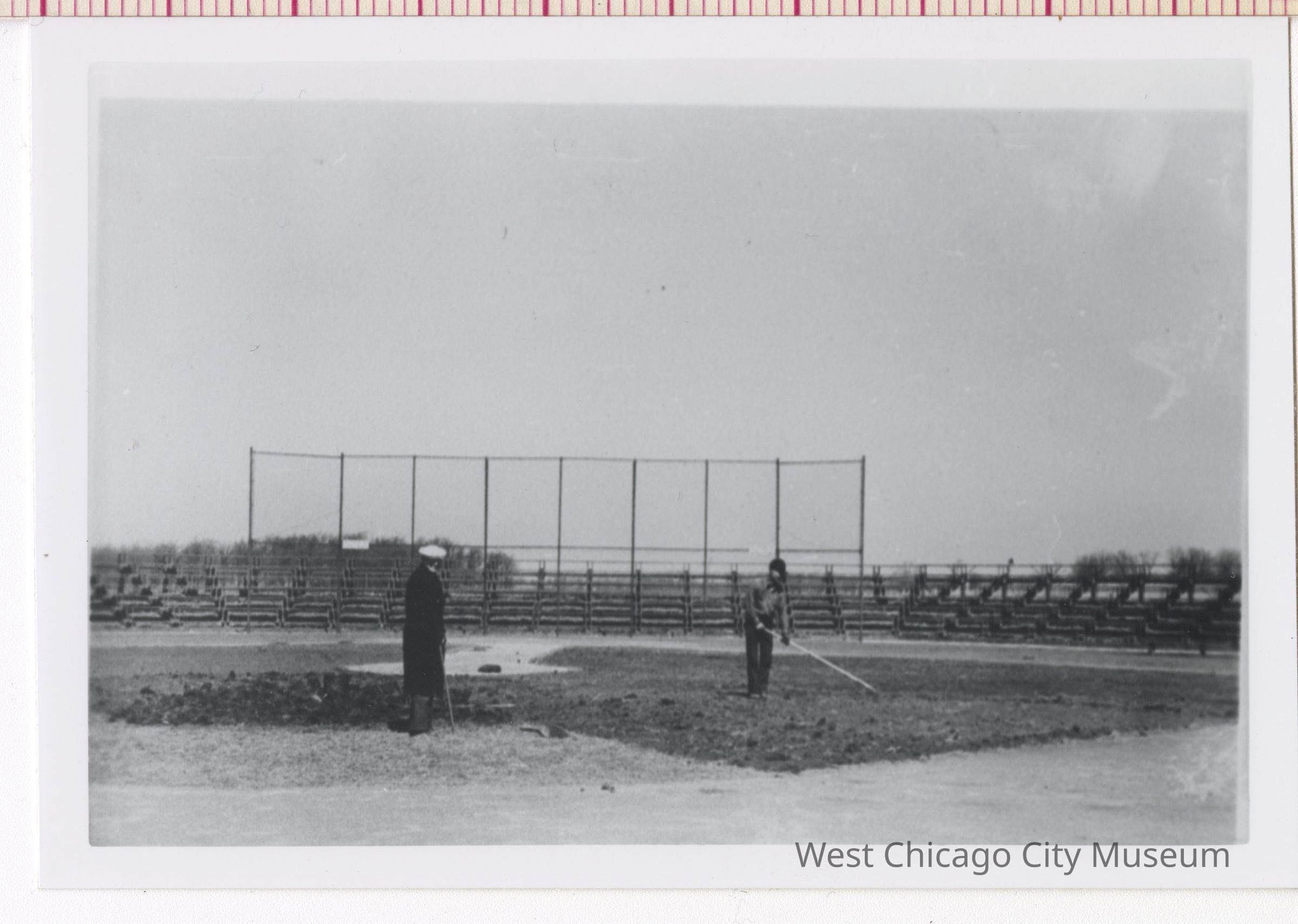Workers raking out a baseball field