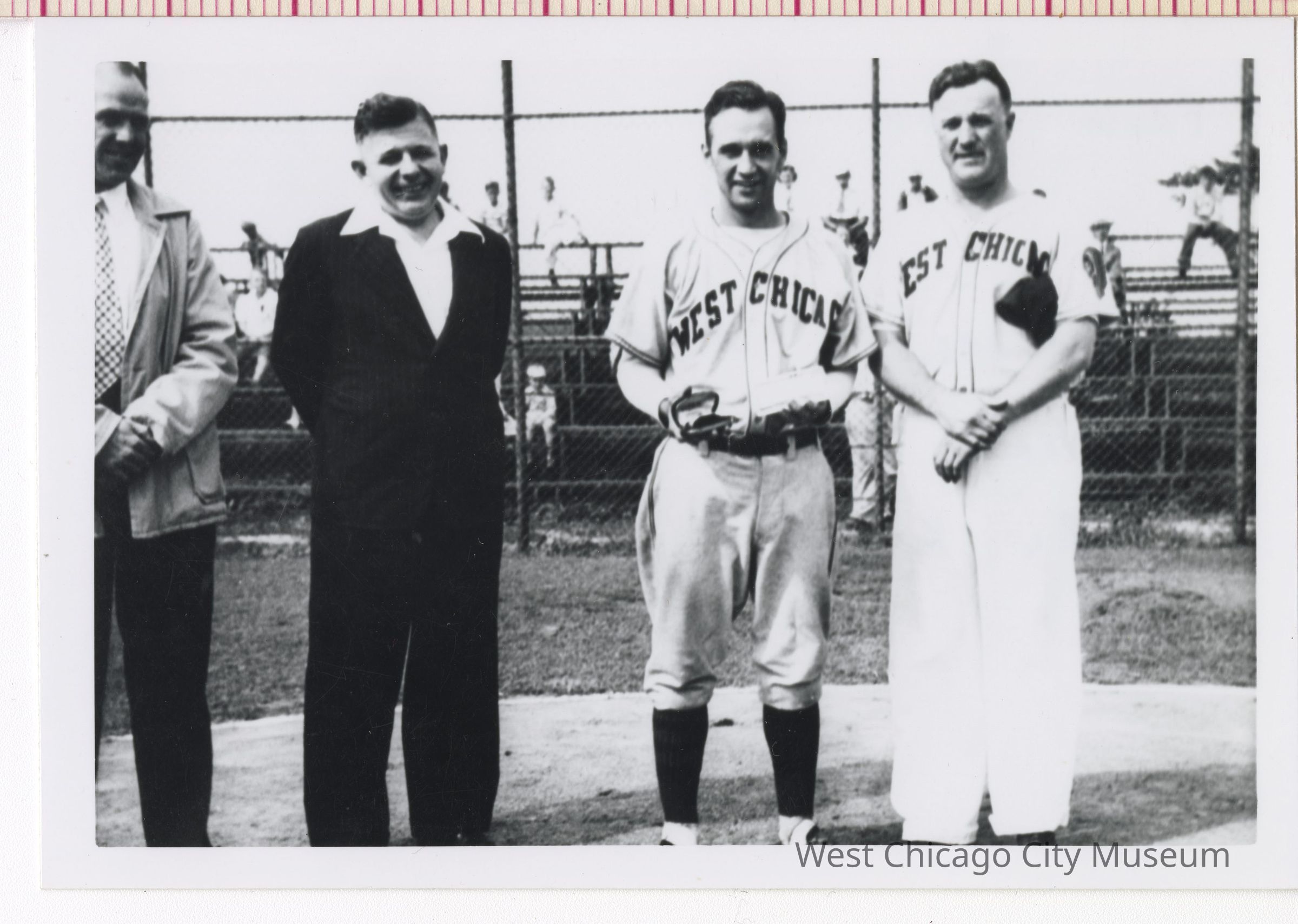 Four men at a baseball game, two are players