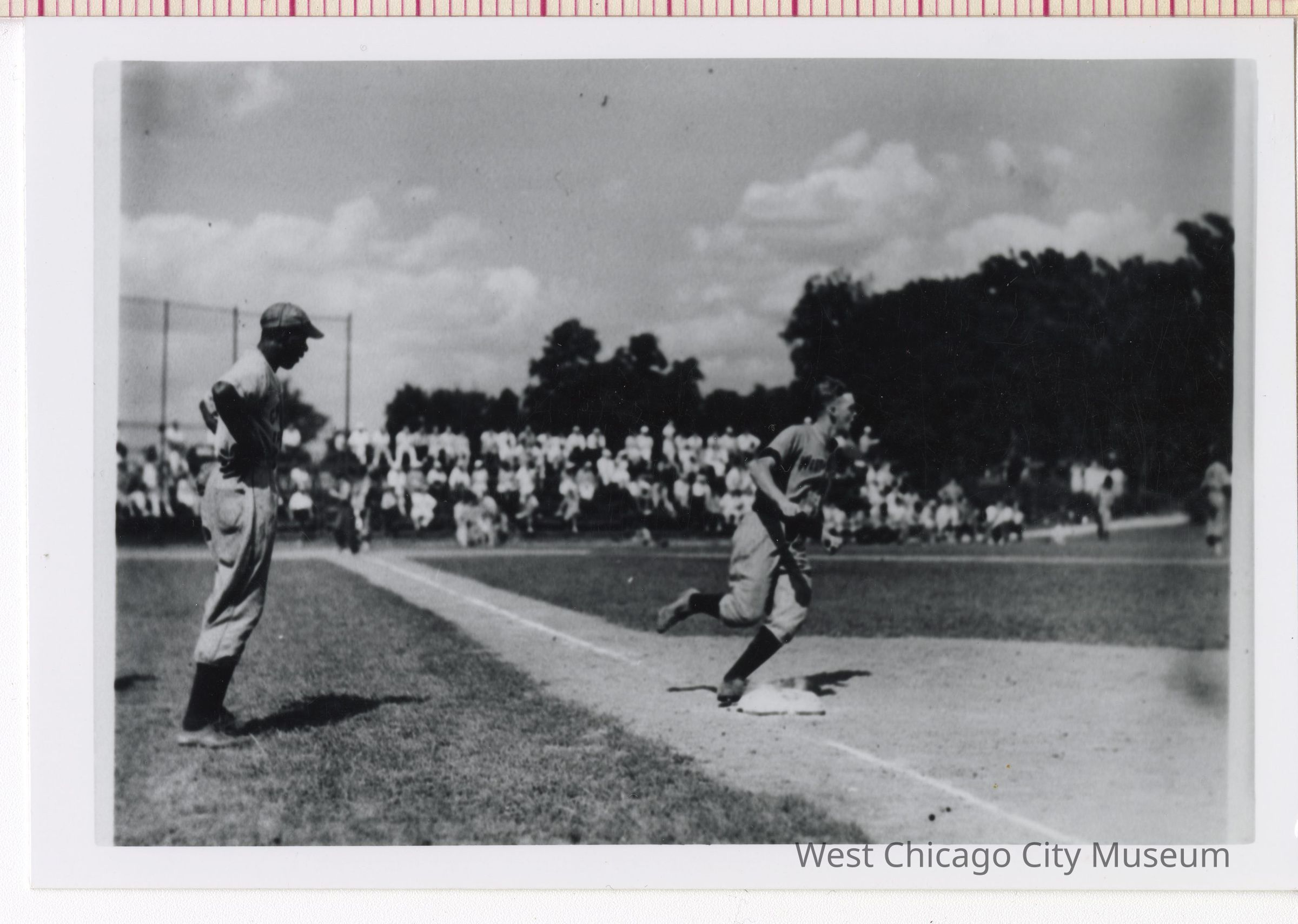 Baseball game, player running through first base