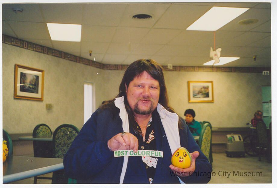 Photograph, 6x4 inches, showing a man with long hair and connected goatee and mustache holding a small painted gourd and the tag on it reads "Most Colorful". Photo taken at West Chicago Terrace, during the Pumpkin Decorating Contest. c. 2003.