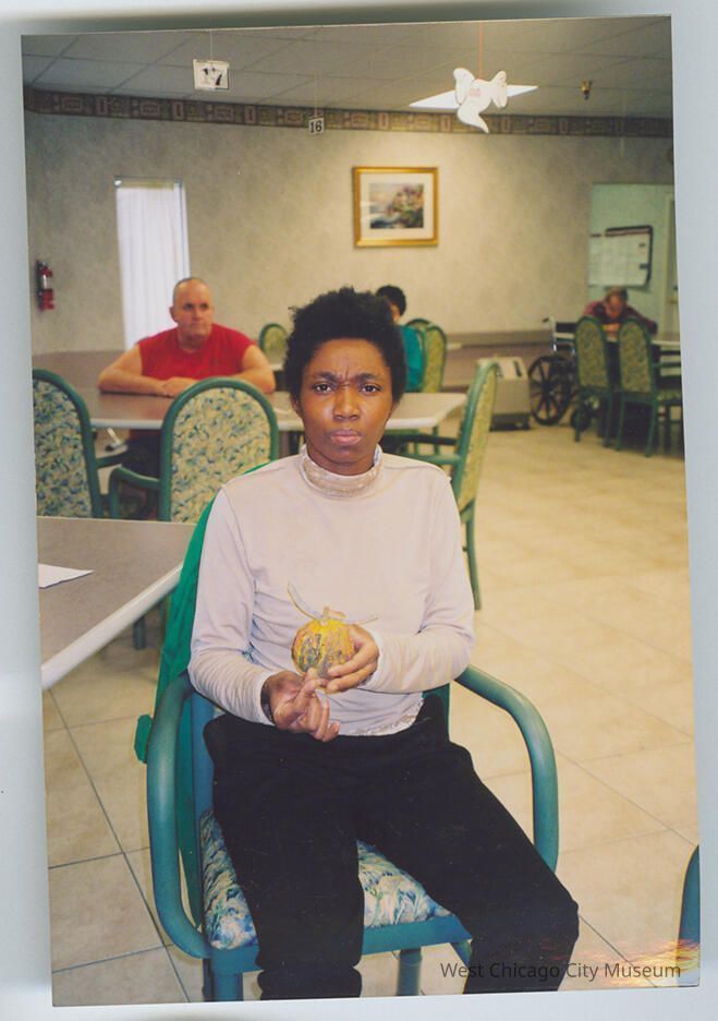 Photograph, 6x4 inches portrait format, showing a seated young woman in a whitish turtleneck, holding a small painted gourd. She seems to be looking very seriously at the camera. Photo taken at West Chicago Terrace, during the Pumpkin Decorating Contest. c. 2003.