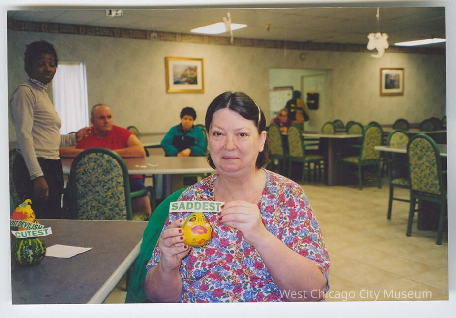 Photograph, 6x4 inches, showing a seated woman in floral shirt and short dark hair smiling at the camera, holding a small painted gourd and a tag that reads "Saddest." Photo taken at West Chicago Terrace, during the Pumpkin Decorating Contest. c. 2003.