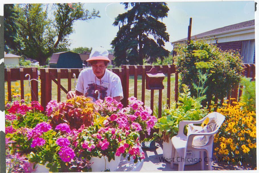 Photograph, 6x4 inches, landscape format showing Betty Jeppsen (?), working on a large number of hanging pots with begonias in them. She is wearing a white t-shirt, white bucket hat with pink rim and a name tag from the University of Illinois Extension office. Back has date stamp, Aug/5/04 (8/5/2004). Photo possibly taken at the West Chicago Terrance garden.
