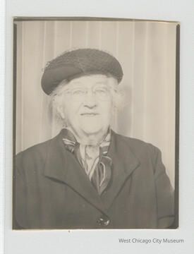 Photograph, Cora Rogers Williams as an older woman in glasses with white hair, c. 1945. She is wearing a coat and striped silk scarf, and rounded hat with netting. Photo measures 1.5 x 2 inches, black and white.