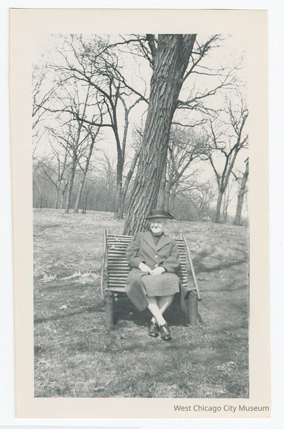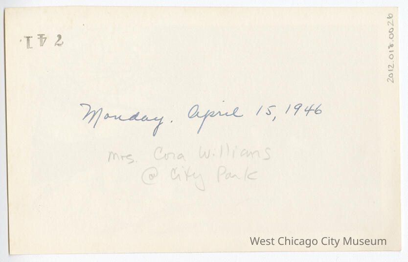 Photograph, black and white, portrait orientation. Shows the Cora Rogers Williams seated on a rustic bench made of branches outside in spring at "City Park" (presumably West Chicago), with bare trees in the background. 3.25x5.25" On the back in pen is written "Monday, April 15, 1946". Below that, in pencil, is written identification of front.Photograph Details