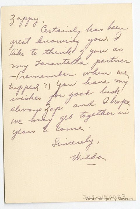 Photograph, likely Wilda Williams (later Shamrock). Shows a girl with her hair up and waved, smiling at the camera. Her clothing is dark on the right side, light on the left. On the back is a note to "Zappy" wishing her well in the future and reminiscing about when they were tarantella dance partners (and they tripped). 3 x 4.5 inches