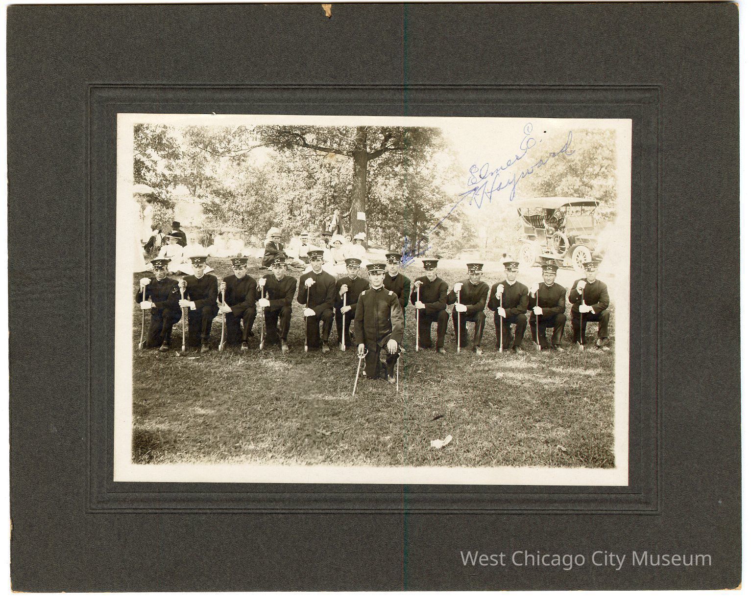 Photograph, Modern Woodmen of America picnic, July 4, 1911. Shows a line of men on one knee in pseudo military uniforms with swords, with a commander in front. There is a car and families seated behind, at High Lake, West Chicago. Elmer Hayward is the only person identified, to the right of the commander in front. Photo print is 7 x 5, mounted on 10x8 cardboardPhotograph Details
