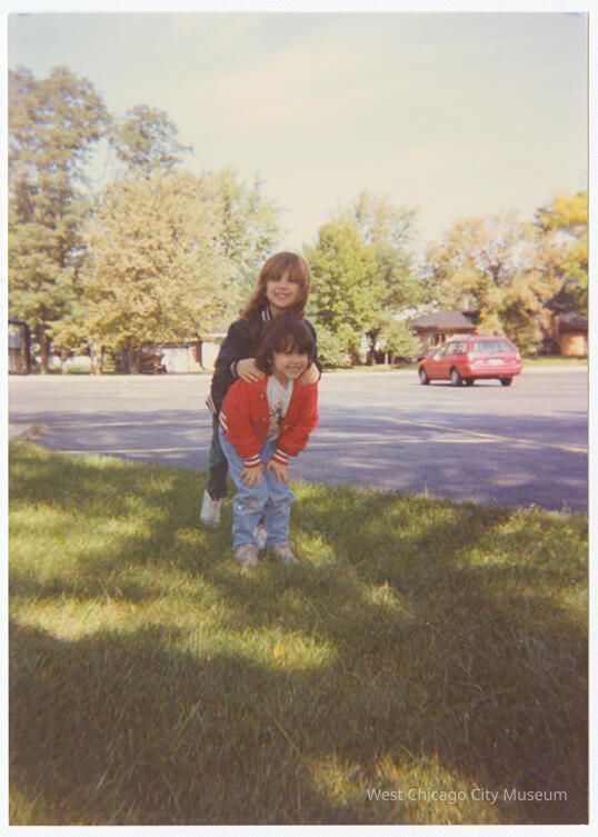 Photograph, color, showing two children about aged 5 on grass in front of a parking lot. The front child is in a red packet and is crouching with her hand on her knees. The on in the back has her hands on the first girls shoulders and is looking over her head. Both are smiling. There is a red station wagon in the background.