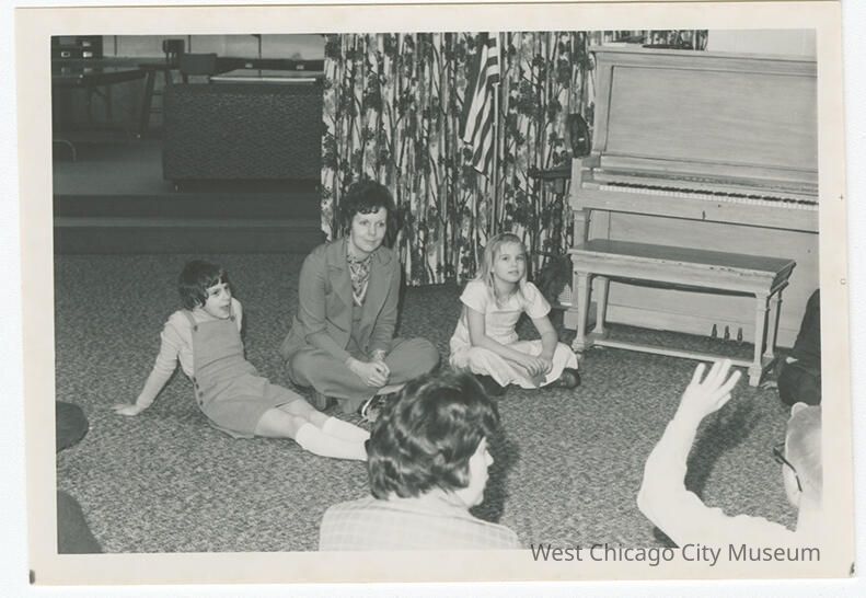 Photograph, black and white, of children learning at the First Congregational Church c. 1975. Shows two girls, one on either side of a woman, seated on the floor next to a piano. There is a boy lower right with glasses who has his hand raised.