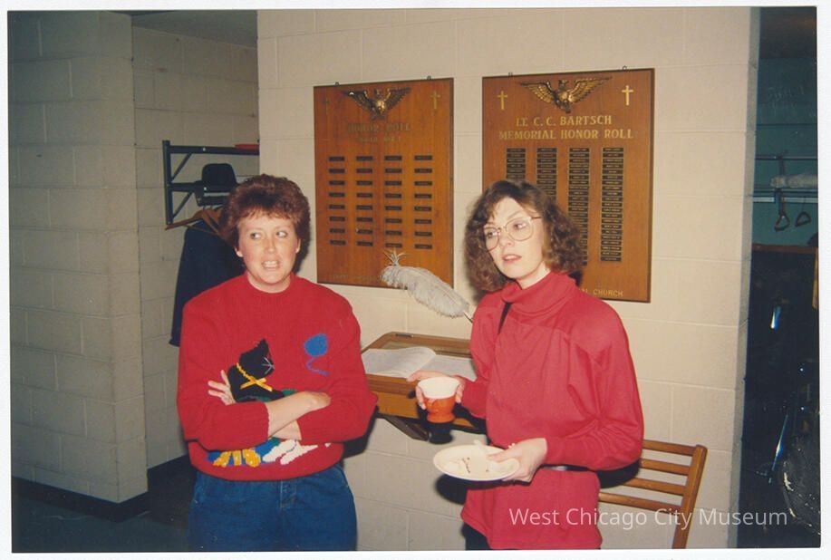 Photograph, color, of unknown reception at the First Congregational Church, c. 2000. Shows two women, both in red, looking off to the left of the photo. The woman on the right is holding a plate and red plastic coffee cup. Behind them is the LT. C. C. Bartsch memorial honor roll.