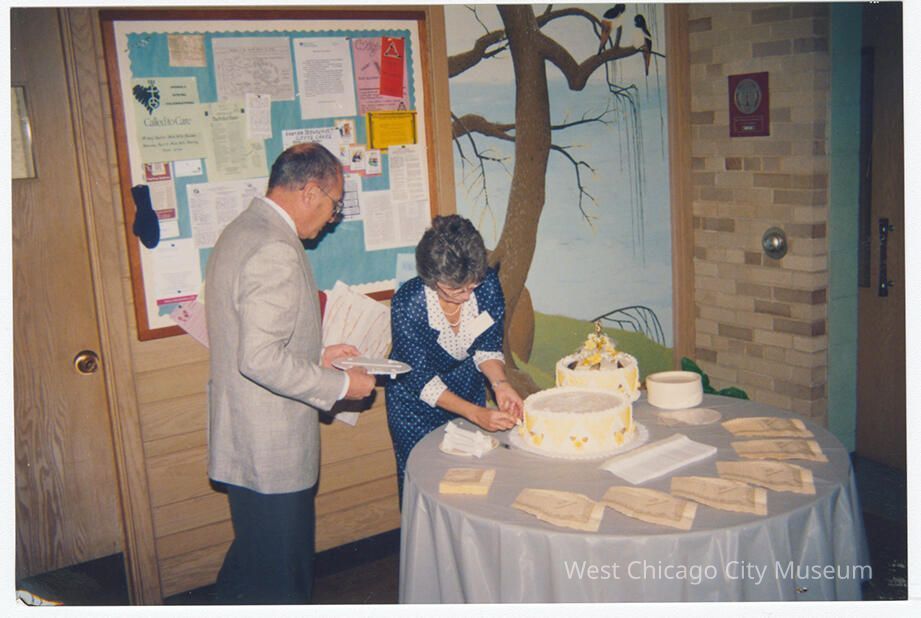 Photograph, color, of unknown reception at the First Congregational Church, c. 2000. Shows a man in a light colored jacket assisting a woman in blue cutting the bottom tier of a two tier cake (top tier removed and set aside.) Behind them is a bulletin board and mural of a bare tree.Photograph Details
