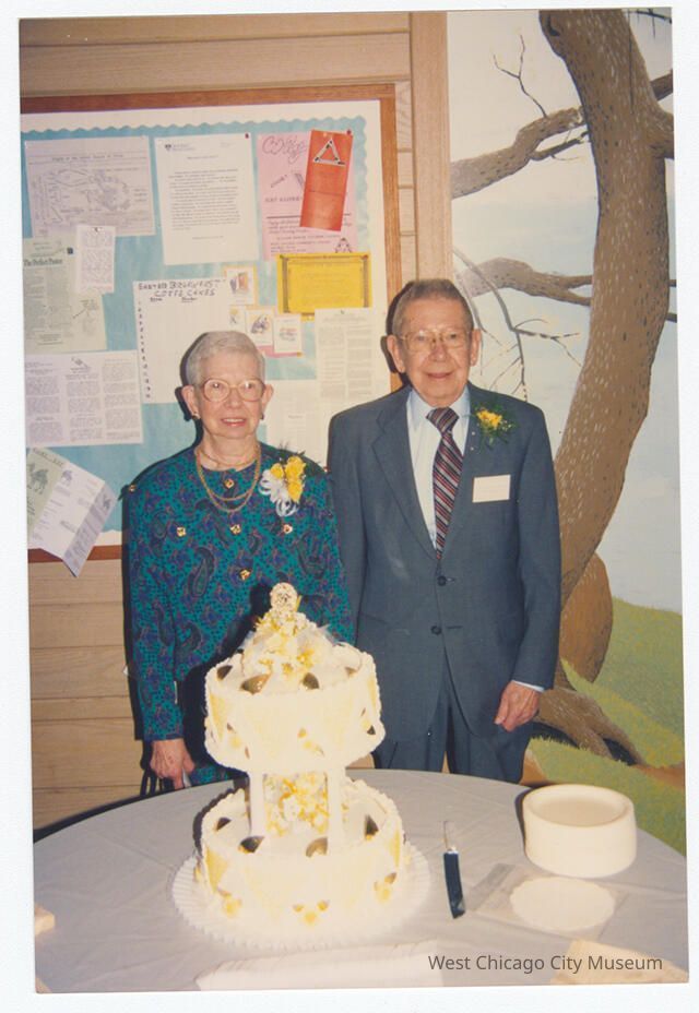 Photograph, color, of unknown reception at the First Congregational Church, c. 2000. Shows an older man in a grey suit with nametag (unreadable) and a yellow boutonniere and an older woman in a paisley pattered teal dress with a yellow flower corsage (likely the guests of honor) standing behind a 2 tier cake. There is a bulletin board and a mural of a bare tree behind them.