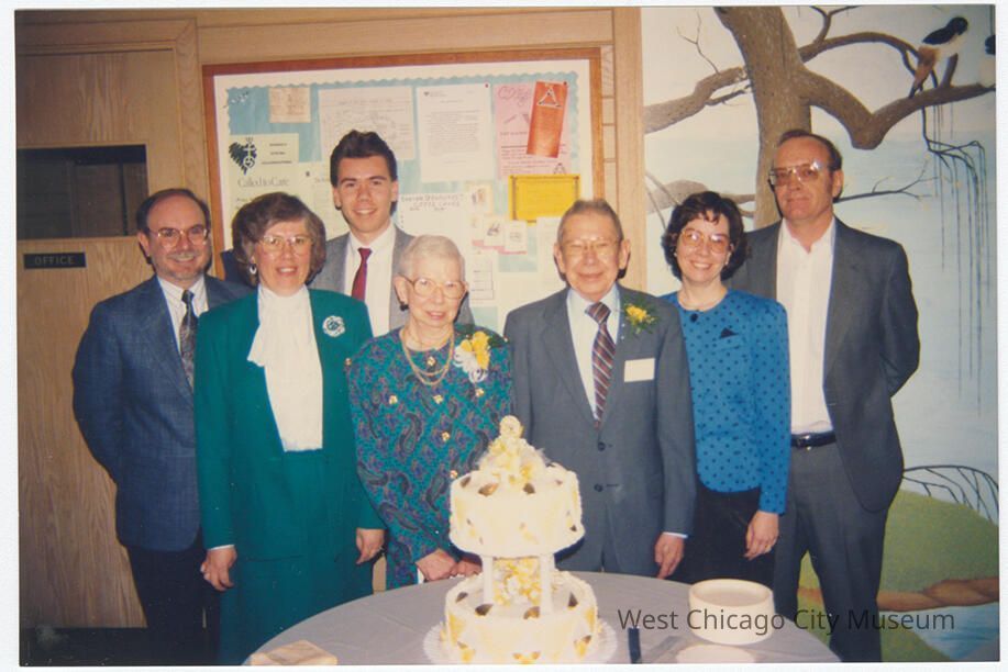Photograph, color, of unknown reception at the First Congregational Church, c. 2000. Shows a group of 7 men and women posed behind a table with a cake, in front of a bulletin board. In the center are the guests of honor, an older man in a grey suit with nametag (unreadable) and a yellow boutonniere and an older woman in a paisley pattered teal dress with a yellow flower corsage. Door to the office on the left, mural of a large barren tree on right.Photograph Details