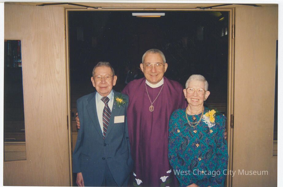Photograph, color, of unknown reception at the First Congregational Church, c. 2000. Shows the Pastor (possibly Welton Warkentin) in a purple robe with white lilies with an arm around an older man in a grey suit with nametag (unreadable) and a yellow boutonniere and an older woman in a paisley pattered teal dress with a yellow flower corsage (presumably the guests of honor.) They are posed in a doorway, and it is dark behind them.
