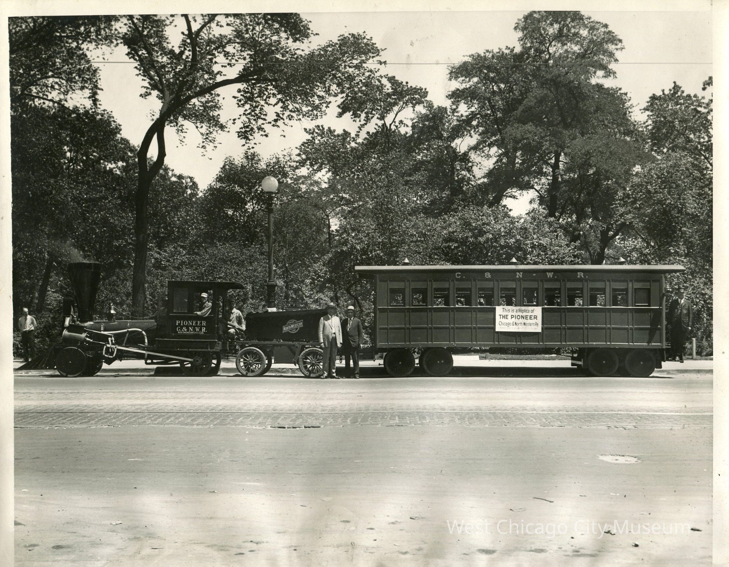 Black and white photo, replica of Pioneer locomotive, tender, and passenger car on street. One man leaning out window of locomotive, second man behind him kneeling and holding wood log. Two men in suits standing on street in front of train between locomotive tender and passenger car. Conductor in uniform standing on platform at rear of passenger car. Man on sidewalk in shirtsleeves is standing at far left behind front of locomotive. Photo taken from across street. Sign handing beneath windows of passenger car reads "This is a replica of The Pioneer Chicago & North Western Ry". "Al Keil" penciled at right side of back. - Siobhan Heraty descriptionPhotograph Details