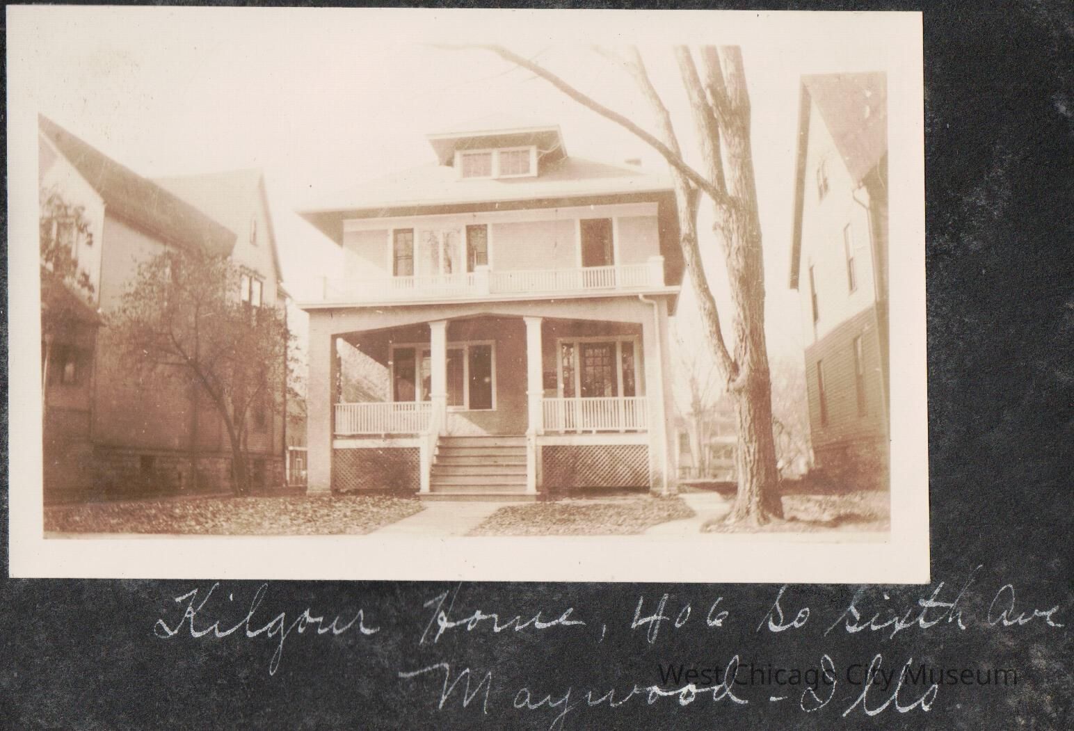 Photograph, black and white, showing the front of a bungalow style home with porch in front, with homes on each side. Photo is pasted on a piece of black scrapbook paper, and below reads "Kilgour house 406 So Sixth Ave Maywood IL" From the Alexander Family AlbumPhotograph Details