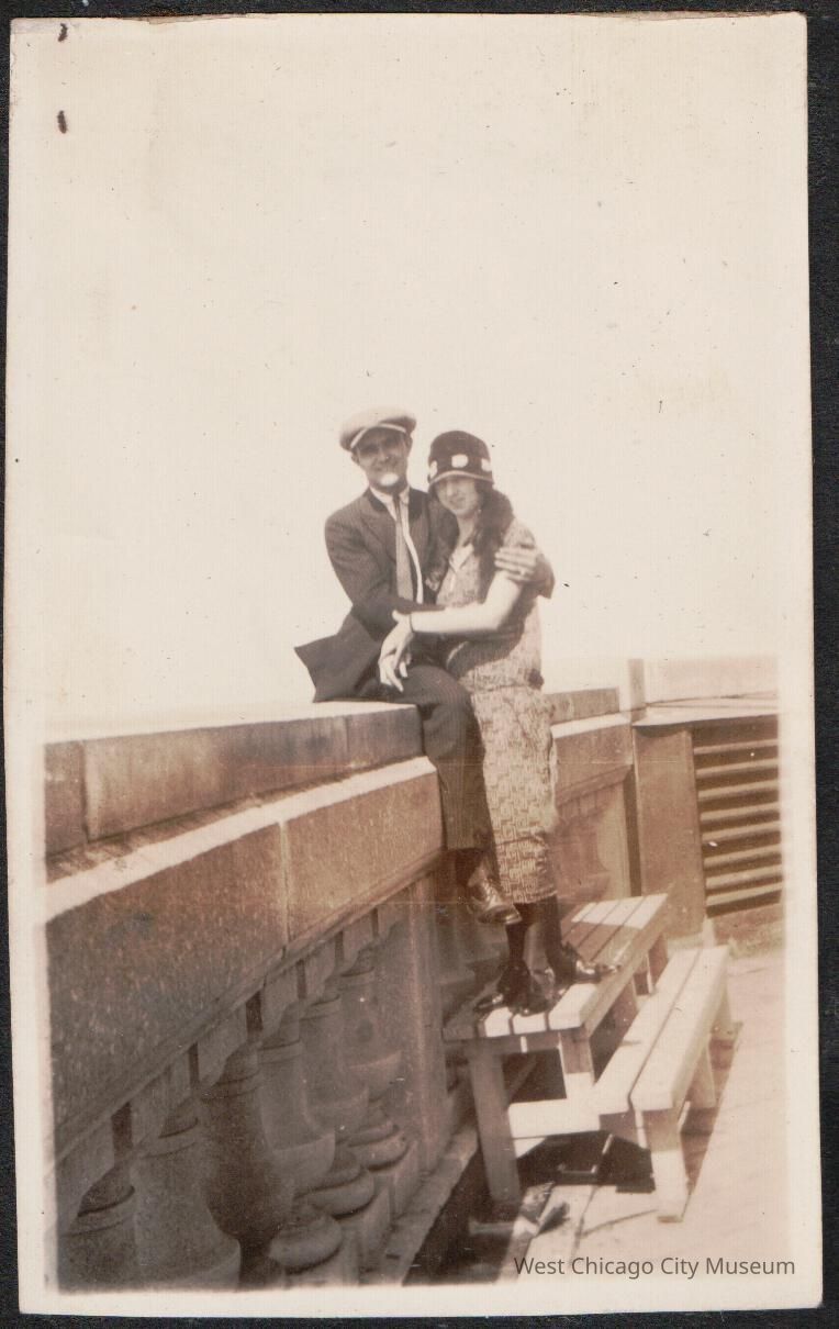 Photograph, black and white, showing a young couple, Clarence and Rose, seated on a concrete wall or fence their honeymoon in Wisconsin Dells 1924. From the Alexander family album
